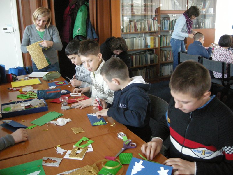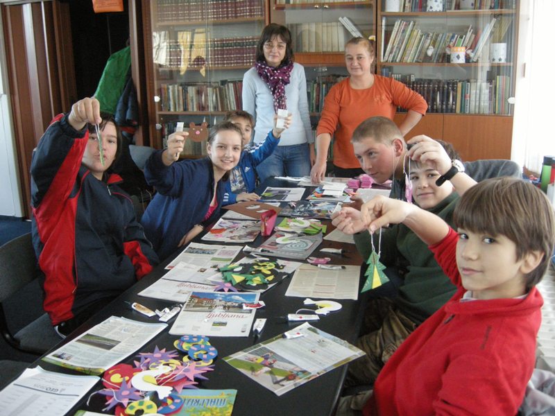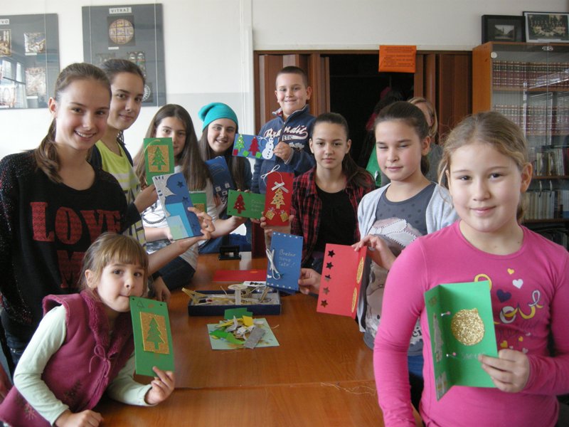 Dragana and Vesna prepared the sweetest workshop. Dragana baked a biscuit and children filled it with cream and decorated it. A tasty biscuit came out of it. They also made cocoa balls. The second workshop was led by Alenka. Skillful children fingers made beautiful greeting cards. In the third workshop, led by Barbara, students made a calendar for 2015. Throughout the year they can have it on their desks. Our workshops were visited by Natalija Veselič Martinjak, a teacher of art in the Elementary School Livada from Ljubljana. She passed on greetings from pupils from Ljubljana and also brought their letters. Natalija led the students of supply teaching lessons of Slovenian in making decorations for a New Year tree. Natalija was accompanied by her son who played accordion and therefore we ended our December holiday workshops with a song. Students learned how to sing a Slovenian folk song „Lisička je prav zvita zver“.