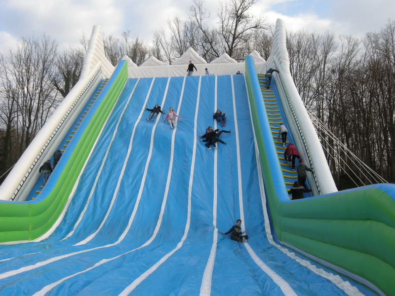 We continued towards Krajina park Kolpa, where we were welcomed with bread of Bela krajina. They showed us wool items, processed flax and coloured eggs of Bela krajina. We ourselves tried colouring eggs. In Metlika we visited a museum and in addition to the visit to collection with a guide we also saw a movie “Images of Bela Krajina”. It was already time for lunch. In the vicinity of three Pilgrimage churches in Rosilnice there is a Home of good bread. Host Mojca waited for us with bread of Bela krajina and tasteful lunch. Following the lunch we all made own loaves of bread. They were baked in a bread oven and each person took one home. Before that, Mojca made bread of Bela krajina and discovered to us what we needed to have in mind while preparing it. We even got a recipe. She showed us a movie about baking bread in the past and nowadays. And what about a dessert? She surprised us with a big book-shaped cake. She wrote thereon: This book contains recordings of beautiful memories and moments you spend together. Full of impressions we headed towards Novo mesto, and on the way there we stopped at a 20-meter long slide. Not only children but also the adults enjoyed going down the slide.