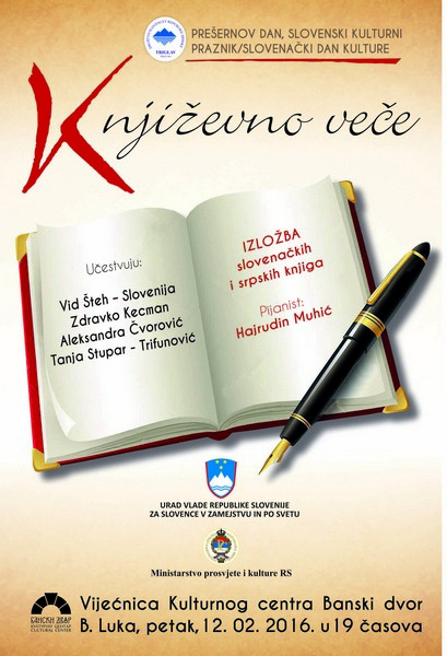 On the occasion of marking the Slovenian cultural holiday the Prešeren’s Day, a successful literary evening of Slovenian-Serbian poetry was held in the Cultural Centre Banski dvor, on 12 February 2016. Organisers of the evening, Association of Slovenians Triglav Banja Luka, Association of Writers of the Republic of Srpska and Cultural Centre Banski dvor, managed this time to host quite a number of audience at such an event.