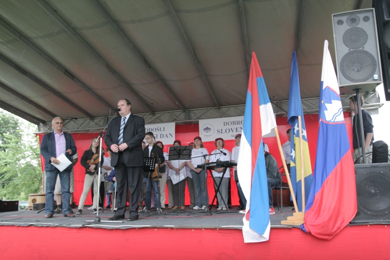 Many associations took part at the Slovenian Day. Among them was also the Society for the Development of Voluntary Work from Novo mesto which brought a folklore group Kres, accordion group “Gorjanski odmev”, young singer and an instrumentalist on a piano and diatonic accordion Valentina Kragelj. Men choir “Maj” arrived from Kranj, and from Banja Luka there were pupils of Elementary School “Holandija” from Slatina, students of Supply Teaching Lessons and Culture as part of our Association, and a folklore group KUD Čajavec. We had a special guest academic painter and poet Mrs Popović, sister of a famous ethnologist from Slatina, Vaso Popović. It was with the song she wrote and read that she wanted to revive the memory of her brother, born in the area. Programme was presented by Mr. Željko Šarić with the assistance of a coordinator from our Association.