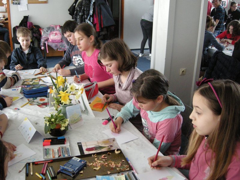 Nature awakes in spring. In all cultures that period is very important. Easter is the major and oldest Christian holiday and at the same time a spring holiday and gratitude to the new life. During workshops, students of Supply Teaching Lessons of Slovenian from Banja Luka and Slatina created what they think of when we say spring. First associations are linked with flowers. Viktor brought daffodils and primroses and each child painted own picture with a motive of spring flowers. They also framed the paintings. This workshop was managed by Alenka – Viki and Nikša’s mother.