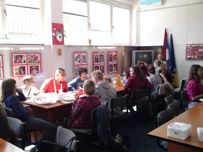 In the afternoon we went for a tour of Banja Luka, while in the evening they stayed at the families of our students. On Saturday, 20 April, we all went to excursion. We visited Equestrian Club Čokorska polja. We heard something about horses and students tried riding a horse. We continued to the rafting centre, by the Vrbas River. We also heard something about the centre there and they also prepared a tasty lunch. The Vrbas River has got incredibly green colour which reminds of the Soča River. It was quite pleasant to sit on the riverbank for a while before returning to the city. On Sunday, 21 April, it was time to part. On the way home the guests visited Slatina, while Mina and Brina, who stayed at their peers in Slatina, waited for us there. We found out how many Slovenians moved to this beautiful healing place and saw the source of health water. The way we started our socialising with tasty ćevapi we also ended it in that way.