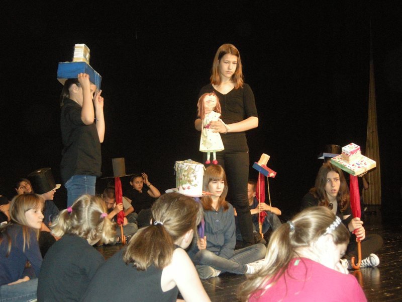 On Friday, they were making masks and puppets the whole day, on Saturday the decided on the roles and practiced and on Sunday they already showed results of their work. A performance “A balloon can also be my umbrella” resulted from the workshop, while children played it to audience who filled in theatre Jazavac. A fairytale by Ela Peroci took us to the Land of Hats. More than 30 children made a performance accompanied by music – one could hear sounds of accordion, guitar and violin. Photographs can tell more than words although it is rather difficult to describe what the children had to make and learn in order to make the performance.