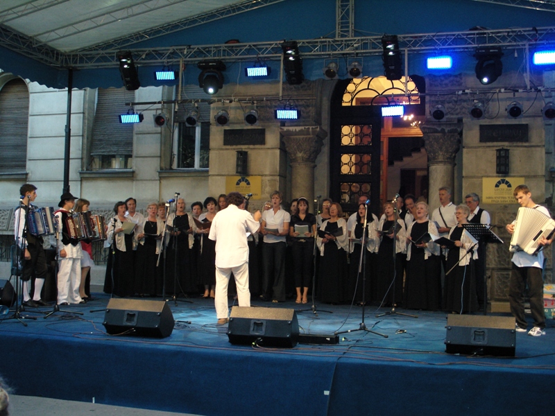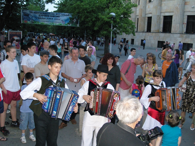 On 21 May, national minorities in Banja Luka organised a show in the centre of Banja Luka. Slovenians from Banja Luka were presented by the Mixed Choir Davorin Jenko, students of the Supply Teaching Lessons of the Slovenian Language, as well as pupils from Elementary School “Ivan Cankar” from Trbovlje, members of a music group “Popotniki”, a young accordion player and a theatre artist from the studio “Anima” Medvode-Ljubljana. We, the Slovenians, presented ourselves at a stand with our national meals and beverages, where the young accordion player from Novo mesto invited curious passers-by to dance.
