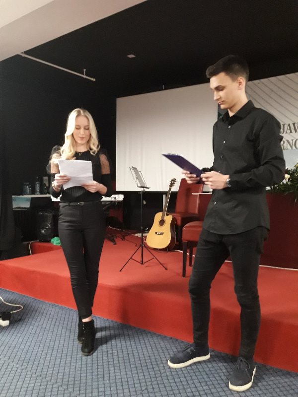 Members of the Slovenian Association of Citizens Jožef Springer Kakanj prepared a diverse program. A traveling exhibition entitled Intangible Cultural Heritage of Slovenia in the Light of the UNESCO Convention has been set up in the lobby of the Cultural Hall. At twenty-four panels, visitors were able to get to know the richness of Slovenia's intangible cultural heritage through photographs and brief descriptions of folk customs, crafts and many other traditions. The participants were greeted by the Mayor of Kakanj Aldin Šljivo, the Ambassador of the Republic of Slovenia to BiH Zorica Bukinac and the President of the Association of Citizens Davorka Drijenčić Špringer. The opening of the exhibition was followed by a programme in the hall of the cultural centre in memory of the great Slovenian poet France Prešeren. Students of supply teaching lessons of the Slovenian language recited songs from Prešeren's poetry, and a trio of musicians, also from the Association, masterfully performed two melodies. The guest of the evening was a journalist and geographer Dušan Tomažič, MSc, who presented his book Slovenian Ethnic Minority in BiH. He also talked about new statistics he found about Slovenians in BiH.