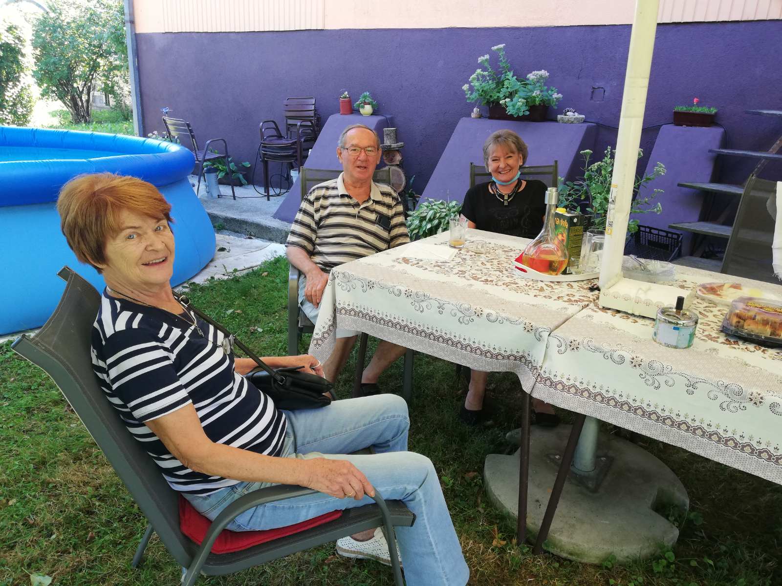 We met all the instructions and wished to see Stanko again after a few months since we had not seen him. Marija, Mira and Nataša came to visit him. It was a beautiful sunny day, a day for pleasant company. At the door we were first greeted by a puppy, a guard dog, who has known us since our previous visits, and immediately behind him a smiling Stanko. I think he was very pleased with our visit. He immediately directed us to the Prosen garden, where a table with salty and sweet snacks was waiting for us, prepared by Stanko's wife Dana, his faithful life companion. In the beautiful fairytale ambience of the garden, where every tree is decorated with bird nests with beautiful flower arrangements, mowed grass, a carriage pulled by deer, perhaps a foal, full of flowers and rich in fertile vines. All of this is re-created by Dana every year. It was an addition to pleasant feelings and casual conversation. Two, maybe three hours of pleasant chatter passed in an instant. We spoke like we used to in our younger age, we were happy, faithful only to our youth, and that is a lot for our age.