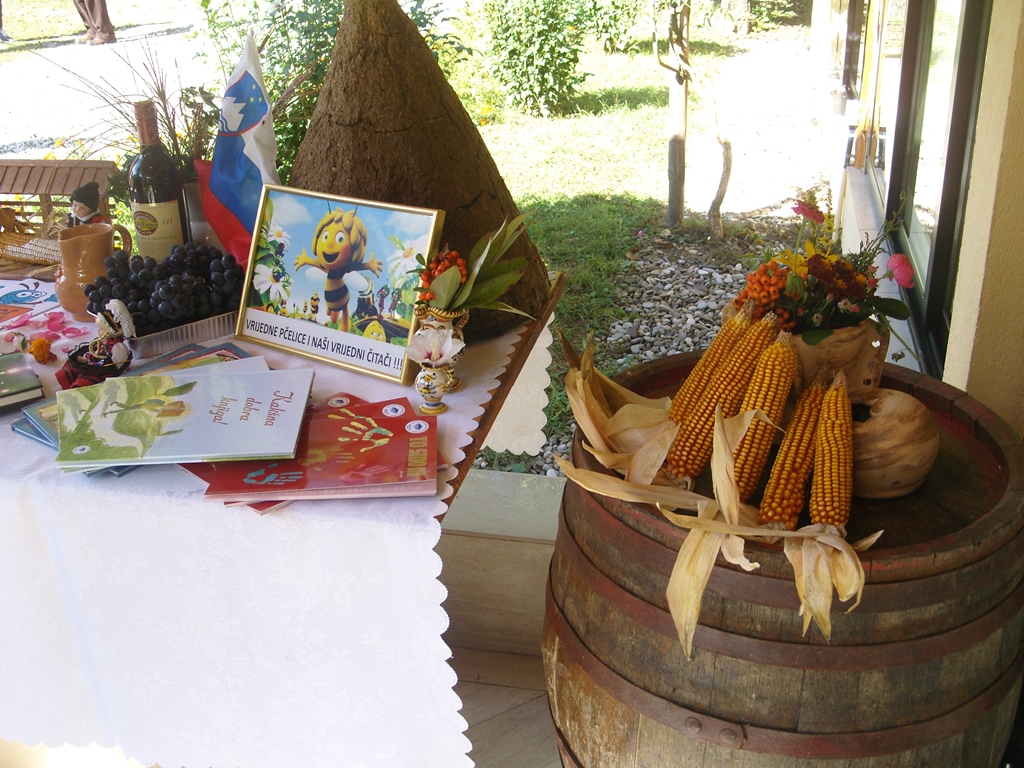 The written words on our stand were enriched by items such as an old beehive, a painted frying pan, a hayrack, dolls in folk costumes, the famous cviček wine from Dolenjska, a small Slovenian flag, Bela krajina bread and piles of other beautiful items.