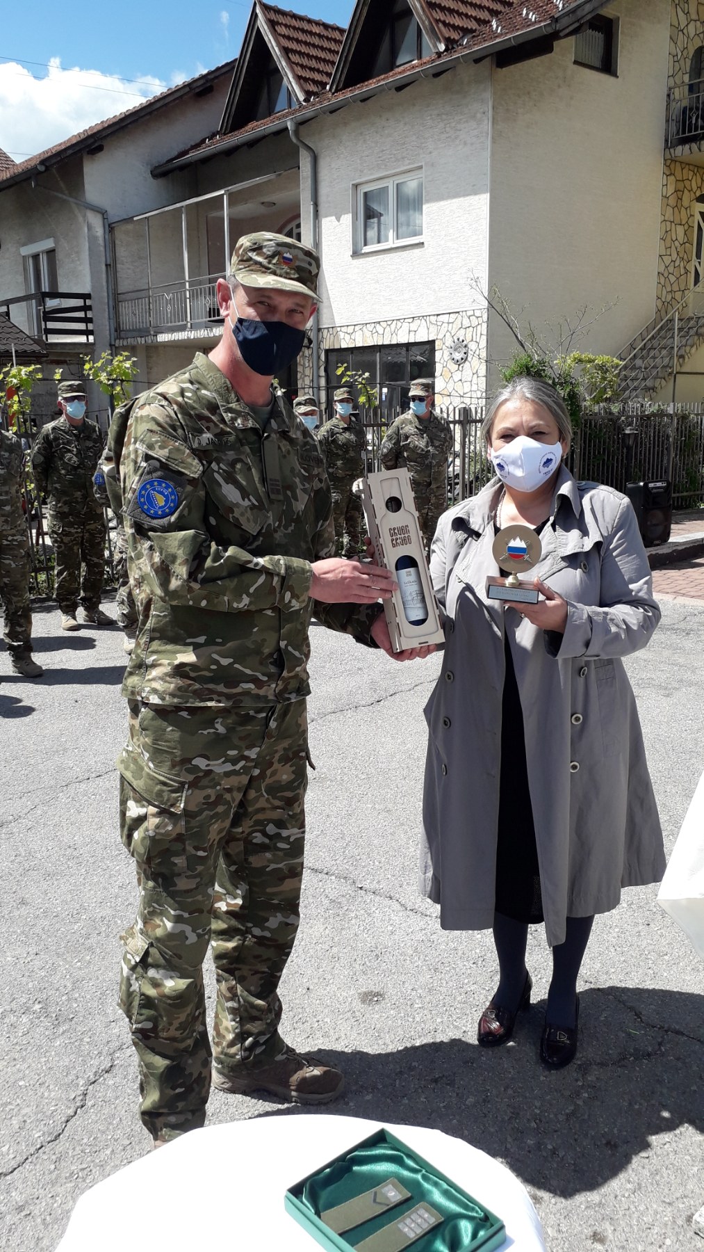 Also, an appropriate gift as a sign of friendship was given to the Association of Slovenians of RS Triglav. Mrs. Žana Pekić, Vice President of the Association of Slovenians of RS Triglav, also had the honour to address the audience. She briefly presented the work of the Association and invited the team of the Army of the Republic of Slovenia stationed in Banja Luka, to all future activities of the Association, to be our dear guests and to spend time with Slovenians here to feel at home.