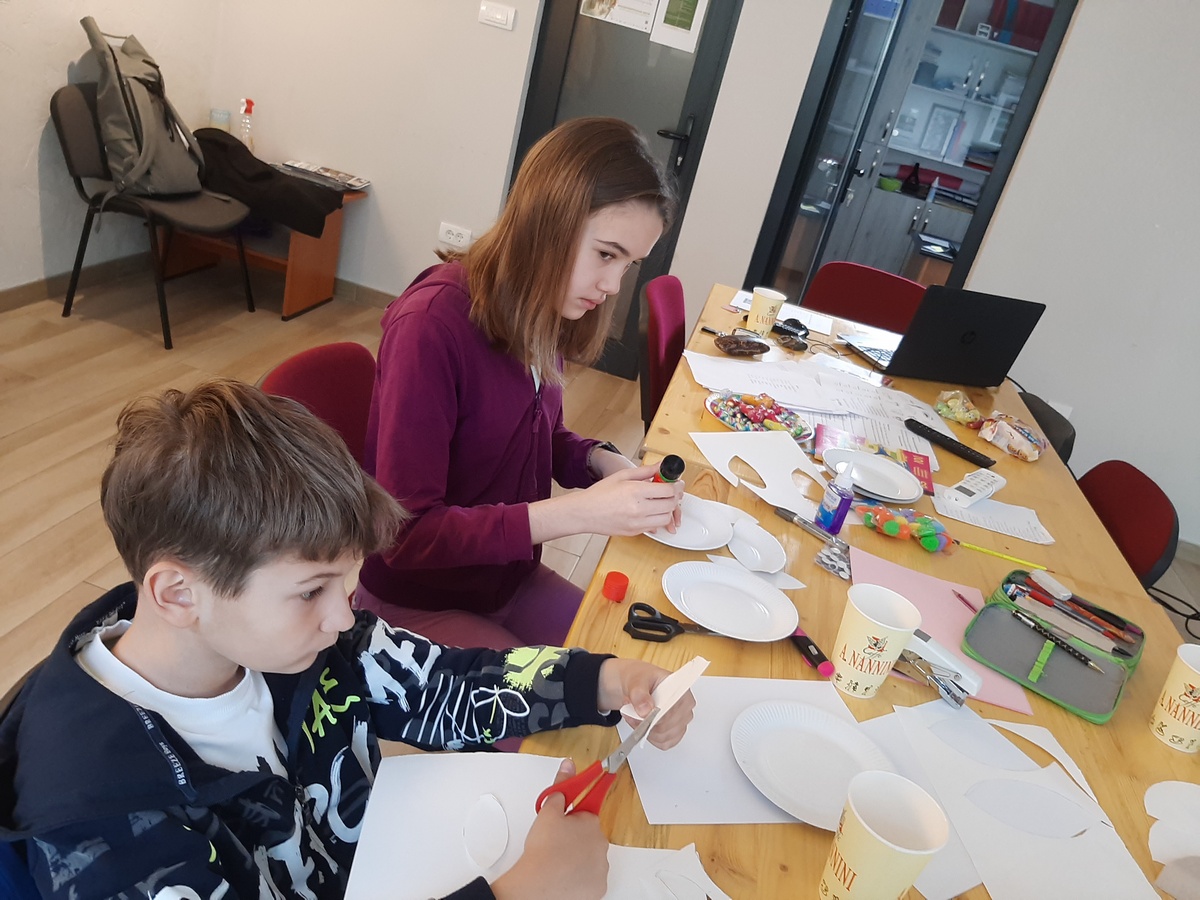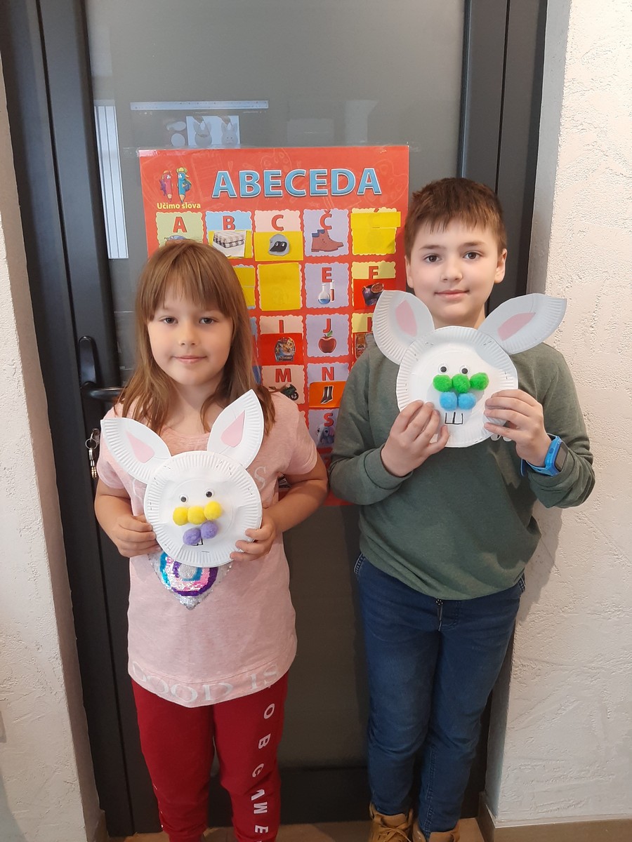 We learned about the symbols of Easter: Easter eggs (pirhi) - a symbol of the resurrection or drops of blood, horseradish - nails, potica (strudel) - a crown of thorns, Easter ham - the body of Christ. We watched a video of how Ljubljana butarica is made and how Slovenians celebrate Easter. The students watched the Easter customs in Slovenia via the Internet (cutting the eggs), made an Easter rabbit out of cardboard, and at the end of the class they had sweets - a chocolate egg and a chocolate bunny. The youngest children painted an Easter colouring book.