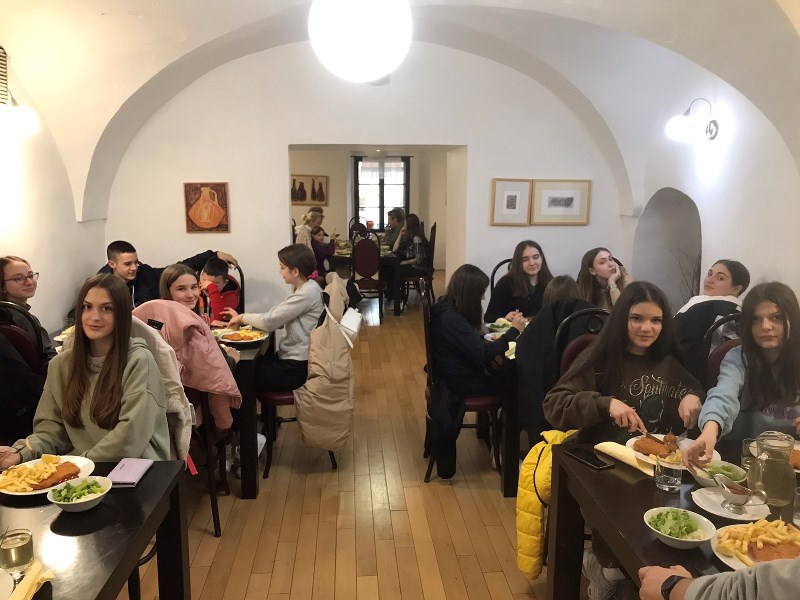 The day before, on April 13, the folklorists arrived in Novo Mesto and, as planned, in the afternoon hours, at the "Janez Trdina" Cultural Center, they had rehearsal with Tomaž Simetinger, PhD, the author of the current choreography they are performing. The exercises carried out were of great importance for the group and the preparation for the performance, and they were realized as part of the cooperation and support of the Association for the Development of Voluntary Work from Novo Mesto. As part of the visit, young folklorists from Banja Luka and Slatina had the opportunity to get acquainted with the main sights of the old city center of Novo Mesto, but also to visit the agricultural estate of the Grm Biotechnical High School, where they got to know their way of working and the possibilities of acquiring knowledge for their students.