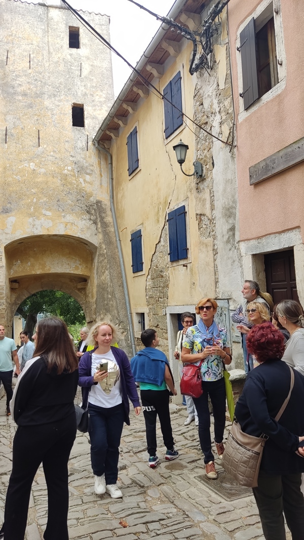 The second day, Sunday, was scheduled for sightseeing in the city of Umag with a guide who tried his best to describe, evoke and show us his city in the most beautiful way. Before that, we went to Grožnjan, known as the "City of Artists", where we were welcomed by the friendly host Rok Zelenko, who led us through the streets of the town and told us about its history. Grožnjan is a small medieval town on a hill next to the river Mirna. It has been declared a city of artists since 1965, and its narrow cobbled streets are full of galleries and studios. In the summer, there is a real artistic beehive, as various art, dance and drama workshops are opened. On this October day, we enjoyed a few hours in that fairytale town, and then we went to Umag again.