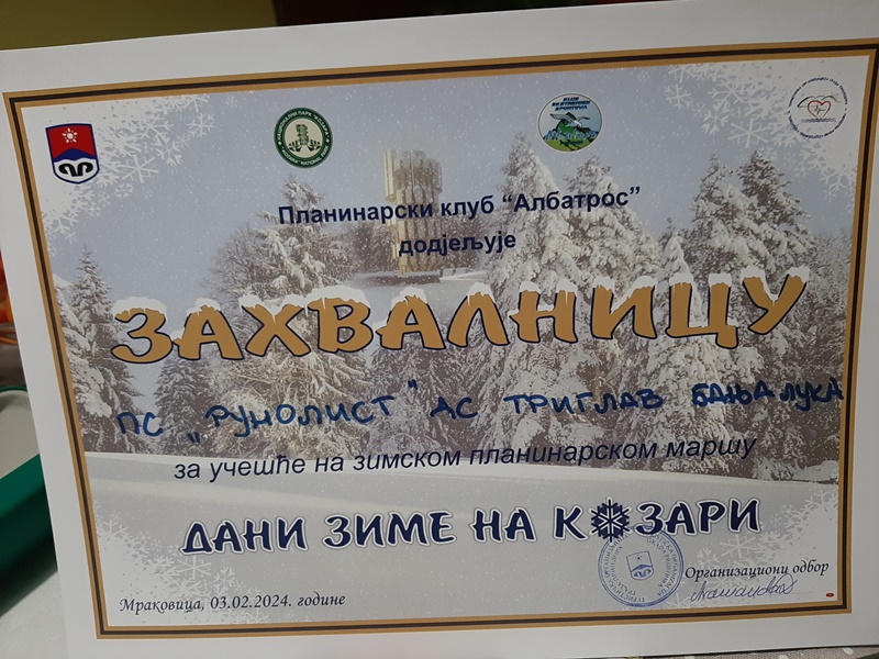 The extreme sports club “Albatros” from Prijedor invited us to participate in the winter youth march as part of the “Winter Days on Kozara” event, which was held on February 3, 2024, for the seventeenth time on our beautiful Mt. Kozara. There was not a large turnout of our mountaineering section members, but that did not stop us from enjoying walking with about a hundred cheerful mountaineers.
