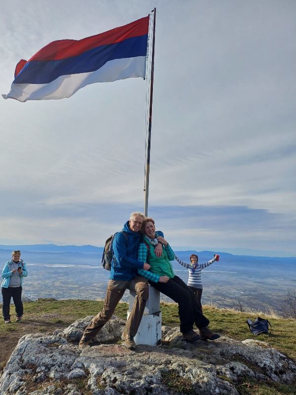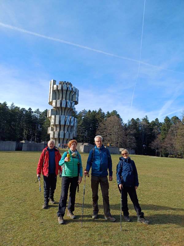 The first break was after the most demanding part of the trail on Kozarački kamen. Out of breath and a little tired we got on the sunlit Kozarački kamen, a view of the beautiful landscape opened up in front of us. That was the reward for our efforts. Of course, we immediately took a picture under the flag that was proudly fluttering in the wind above us. A short rest and we continued on. Because of the wind, we didn't have breakfast on Kozarački kamen, but instead looked for a leeward spot in a hunting lodge that readily offered us its sunny terrace. And then, as our friend Ljiljana says, the most beautiful part of hiking began - breakfast in nature. No matter what kind of breakfast, it's a real feast: dried meat, sausages, bacon, two types of cheese, pickles, red onions and, above all, a glass of brandy as an aperitif. We also hade a cake. Our mountaineer friend Milenko joined us at breakfast. We refreshed ourselves nicely and moved on singing. Milenko showed us a beautiful viewpoint where we briefly enjoyed the sun and took pictures of course. Through stories and jokes, one foot in front of the other and around half past one we reached Mrakovica, where our hosts welcomed us with mountain beans from a cauldron. A little tired, but satisfied, we ate the beans with delight and drank mulled wine. We walked to the monument and visited the memorial plaque for those killed on Kozara. There we saw a wreath of fresh flowers laid by representatives of the AVNOJ association from Slovenia, Serbia and Istria to the victims of fascist terror. So we were reminded of the history of this region, bowed to the shadows of all the victims and wished that such tragedies would never happen again.