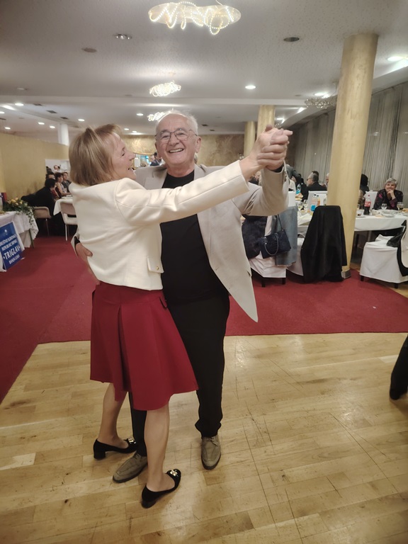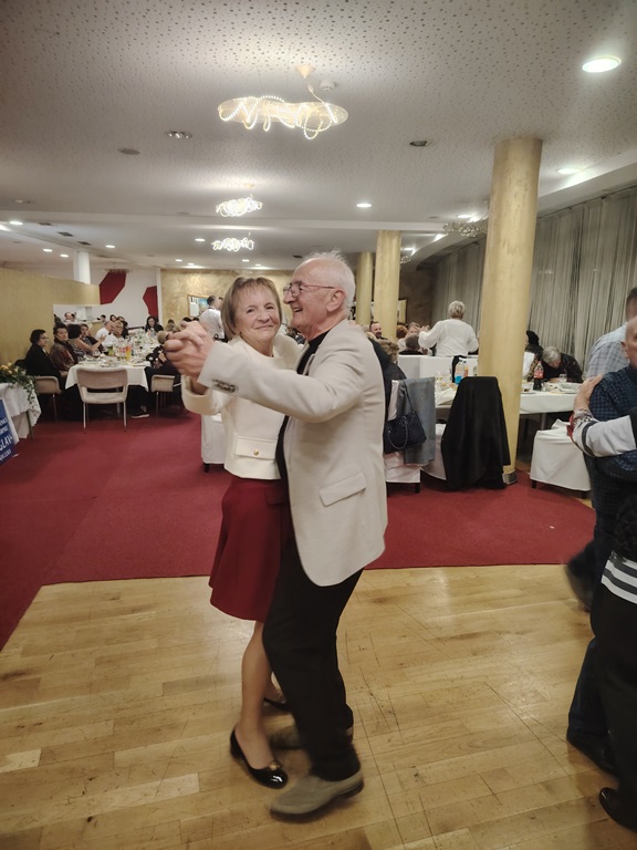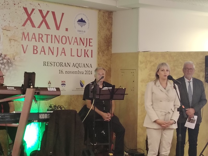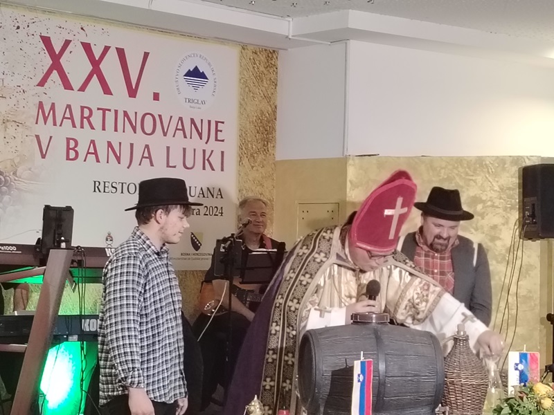 In the program part of the event, the mixed choir "Davorin Jenko" performed two songs under the conductorship of Vanja Topić-Vještica. After the choir, a children's folklore group with choreographer Predrag Savić performed Gorenjska dances and received great applause from the audience. Since Martin's Day is a traditional Slovenian event, dedicated to Saint Martin, the patron saint of vineyards and winegrowers, the traditional baptism of wine was performed in a humorous manner by a long-time friend of the Association, Peter Kirič from Ormož, with the help of winegrower Miran Trop and his son. Then, everyone present was entertained by a musical duo brought from Novo Mesto by Branka Bukovec from the Association for the Development of Voluntary Work. We celebrated this traditional event in a good atmosphere with dancing and pleasant company with traditional Slovenian autumn food. This year, we were joined by Nevena Blagojević – Podrić, the Head of the Department for Culture, Social Welfare, Citizens' Associations and Religious Communities with associates from the City of Banja Luka, Miha Vilar, Consul from the Consular Office of the Embassy of Slovenia in Bosnia and Herzegovina, Novo mesto, Igor Kotjelnikov from the Ministry of Education and Culture of the Republic of Srpska, Ženja Simonič from the Slovenian Emigrants' Association, Metoda Perger, the new Slovenian language teacher in Banja Luka and Prijedor, representatives of national minority associations of the City of Banja Luka, representatives of Slovenian associations from Bosnia and Herzegovina and numerous members of the Association. The event was organised with the financial support of the Office of the Government of the Republic of Slovenia for Slovenians Worldwide, the City of Banja Luka, the Ministry of Education and Culture of the Republika Srpska and the Ministry for Human Rights and Refugees of BiH, and sponsors.