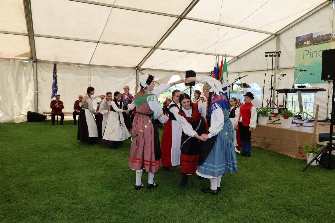 This local community was founded a century ago by Slovenian immigrants from Primorska and Istria, seeking a safer home and place for their descendants, fleeing from the coming fascism and oppression by the new Italian authorities. Sharing a similar fate of descendants of emigrants, our association has been nurturing a fraternal bond with the association "Primorci i Istrani u Prekmurju" for a whole decade, and at the invitation of their president, Nataša Tomšić, we participated and attended the cultural and entertainment program marking their great jubilee. Beside our folklore group, the program included: flag bearers, a brass band, a singing group, soloists and a trumpet trio. The performance of our folklore group attracted a lot of attention from about 500 visitors to the event, and everything took place under a big tent right next to the football field of NK Graničar and the premises of the community center. The program was followed by a pleasant gathering with the already well-known and dear hosts, who warmly welcomed us, whereupon all present were served the traditional dish "bograč". After a tour of the memorial barracks with exposed objects and tools, which were used by the residents of Pince Marof and Benica when they moved to new areas, there was a farewell and then a tour of the sights of Lendava.