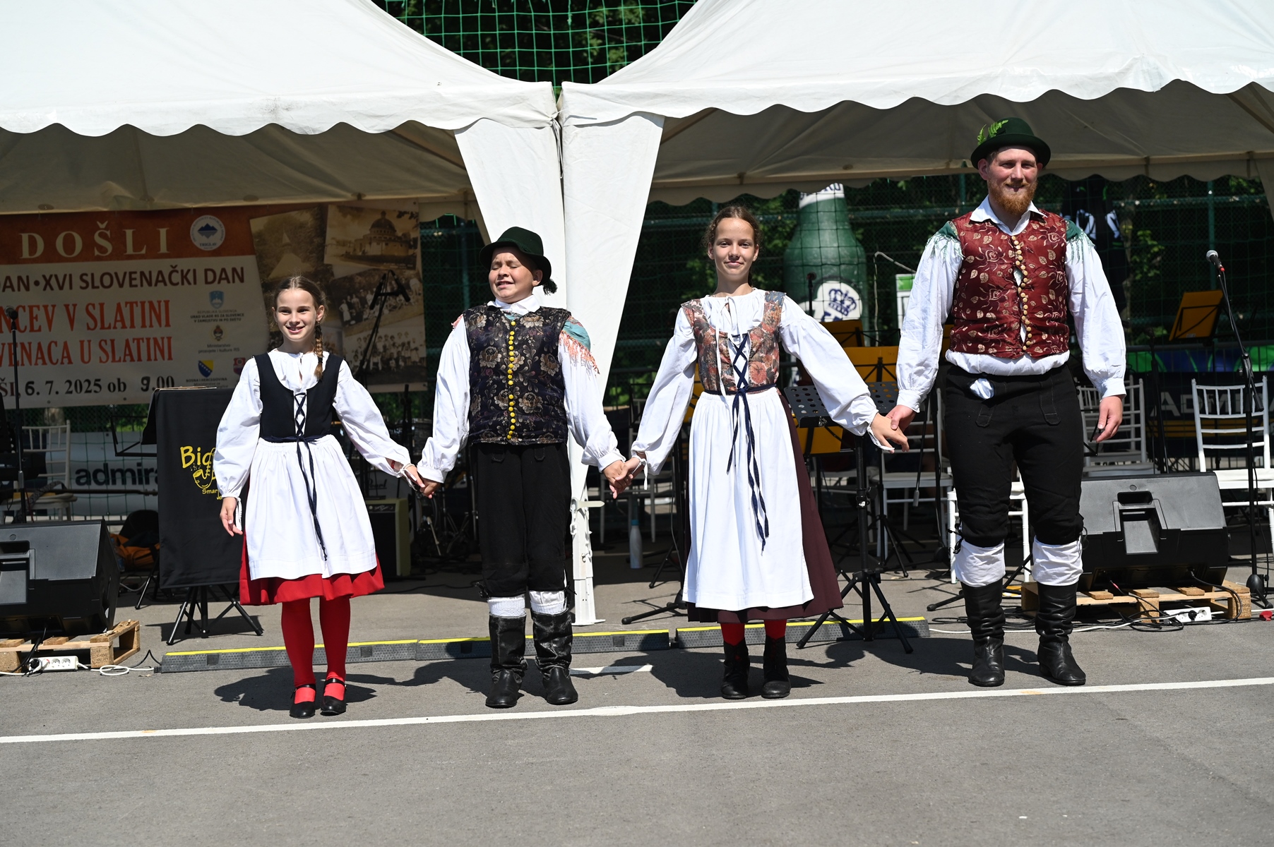 Her performance started the cultural program in which the mixed choir of our Association "Davorin Jenko" participated by performing two songs: "Lepa Nera" and "Dajte, dajte". Students of Slovenian language and culture classes, Marija Budiša from Slatina, recited a song by Feri Lainšček, My Slovenia, while Marija Mihajlović from Trn sang the song "Three Birds". The choreography "Tangle of Koriška dances", which we were unable to see last year due to heavy rain, was performed by the children's folklore group of our Association, which, as expected, won the hearts of all present. At the end of the program, a group that was young in terms of age, but with an artistic impression surely serious male choir of the Grammar School from Celje, performed under the name "FaVoZa". The choir is led by the experienced and dedicated conductor Gregor Deleja, known to our audience from the performances of ''Octet 9'', back in 2014 in Banja Luka and Slatina.