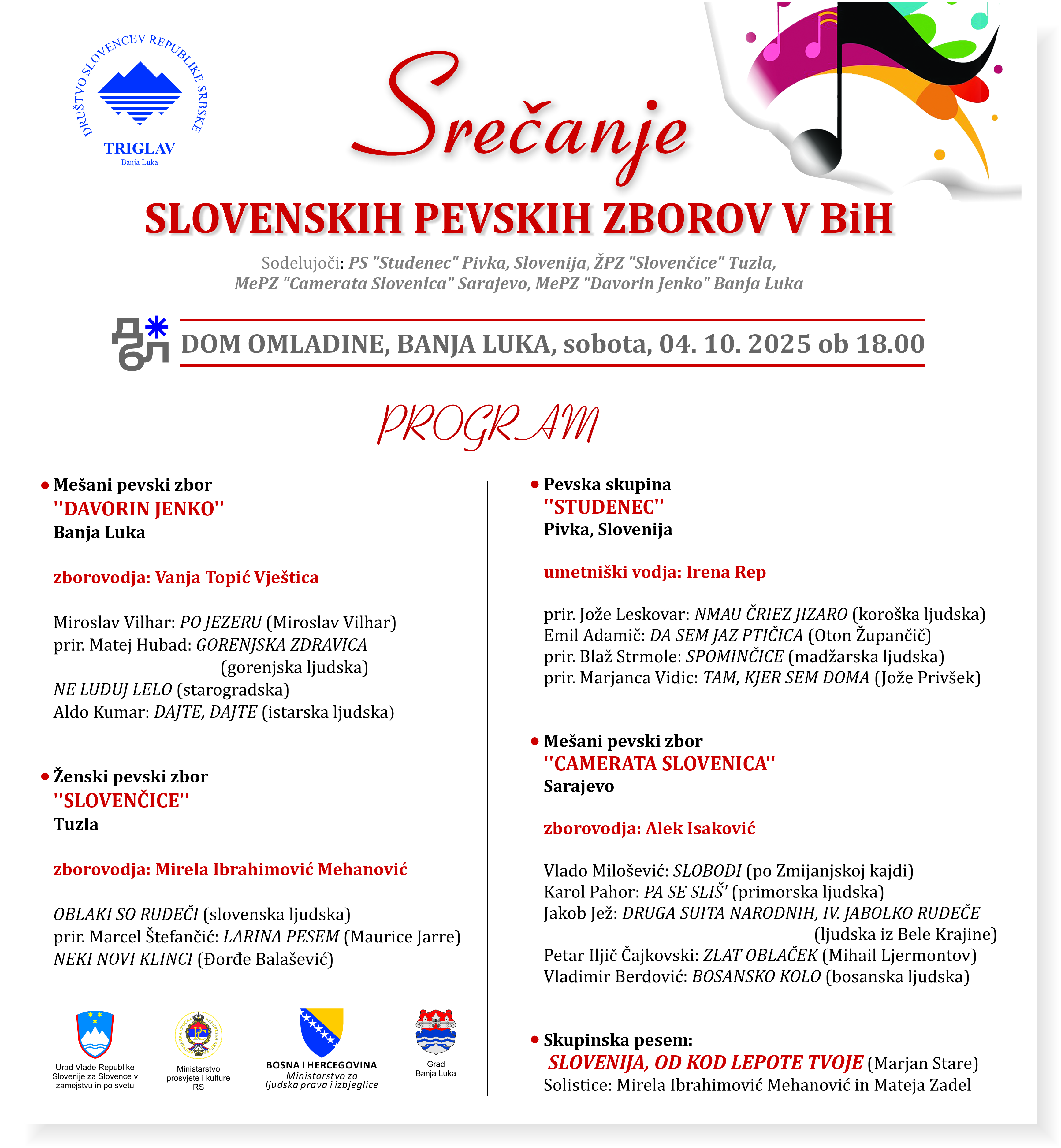 On October 4, the traditional Gathering of Slovenian Choirs in Bosnia and Herzegovina was held in the Banja Luka Youth Center, which has long since become a meeting point for various cultural events in our city.