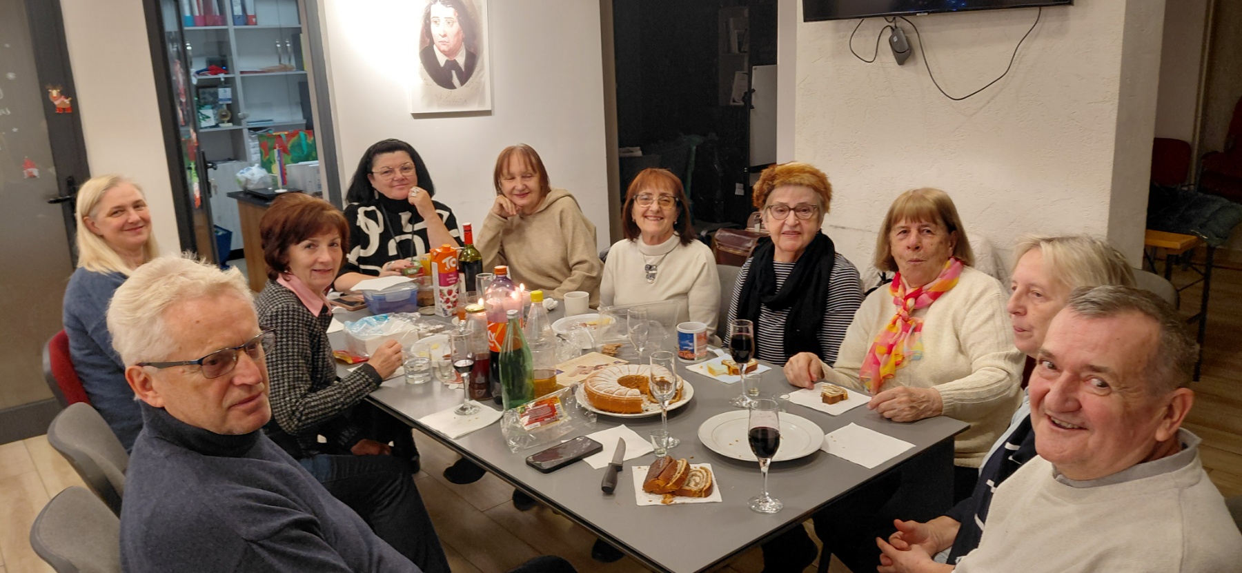 Metoda, with the help of the younger students, decorated and arranged the classroom, so when we came to class, the atmosphere was pleasantly festive. We also brought some Christmas treats and wine and had fun talking to the sounds of Slovenian pop music. Everyone was entitled to one musical wish. As a highlight of that pleasant evening, something happened that no one expected, Santa Claus visited us! We were really surprised, but also happy because it brought us back to our childhood for a moment. We took gifts and, of course, immortalized it with a photo. Santa didn't forget our dear hard-working teacher and brought her beautifully decorated, handmade, woolen socks. Ho-Ho-Ho
