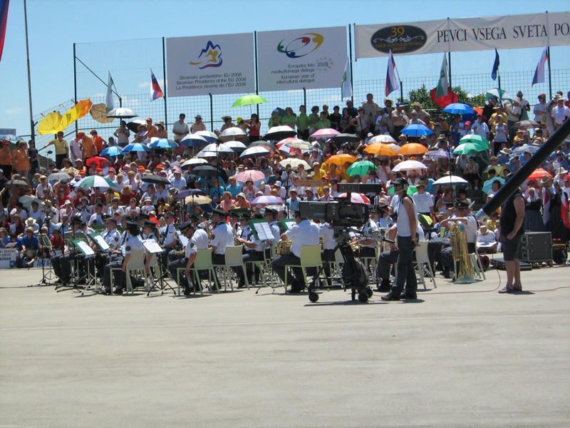 Mixed choirs simultaneously sang five songs originating from various areas of Slovenia and written in different dialects. It was followed by Zdravljica and finally a combination of Slovenian folk songs, accompanied by wind orchestra Stična. Just as every year, (since 1988) all choirs were conducted by a well-known pianist and conductor Igor Švara from Ljubljana.