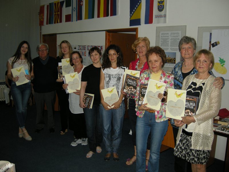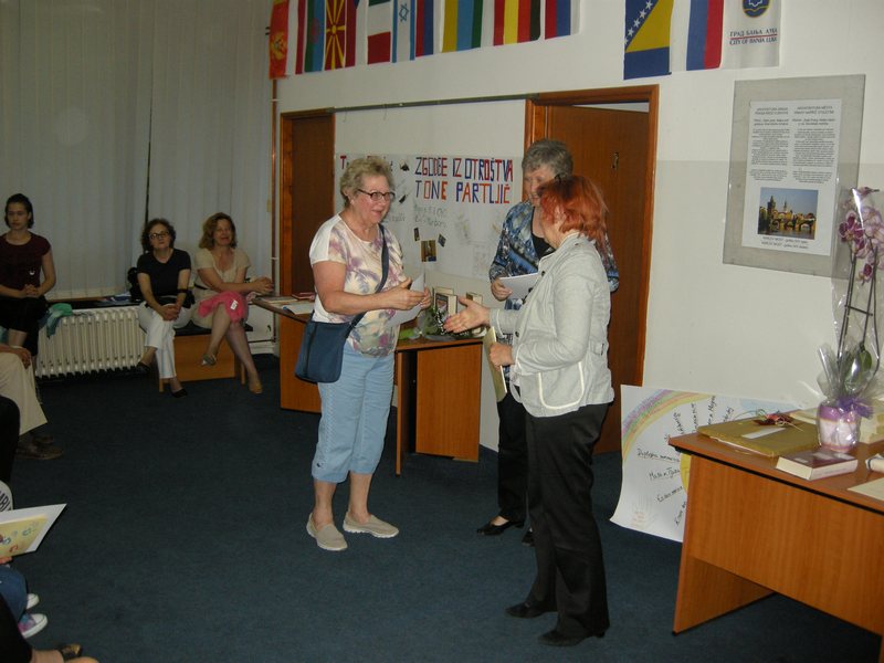 We were visited by two guests from Slovenia - Tone Partljič and Božena Kolman Finžgar. On behalf of the Association of Slovenians Triglav Banja Luka they were greeted by Marija Petković. Slovenian author Tone Partljič prepared an interesting programme, including the performance of students as well, while Božena Kolman Finžgar from the Library of Anton Tomaž Linhart from Radovljica distributed certificates for participation in the project Library – Universe of Treasure. Cooperation with Readers Badge Association and library from Radovljica has been traditional, whereas there are many good readers among adult attendees, eight of which won readers badge, and six received certificates of Library – Universe of Treasure. They also received book awards and aprons. Božena Kolman Finžgar brought many books and magazines to students to prevent the lack of interesting reading material during summer. We are happy to have had June evenings full of stories by Tone Partljič, and his lively story-telling.