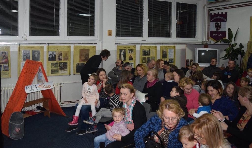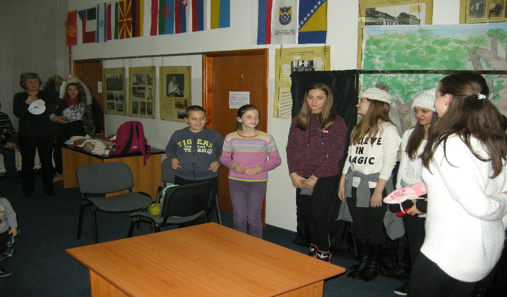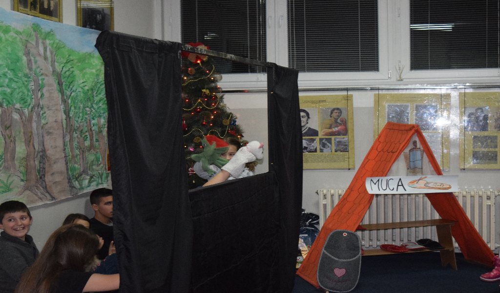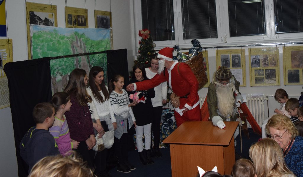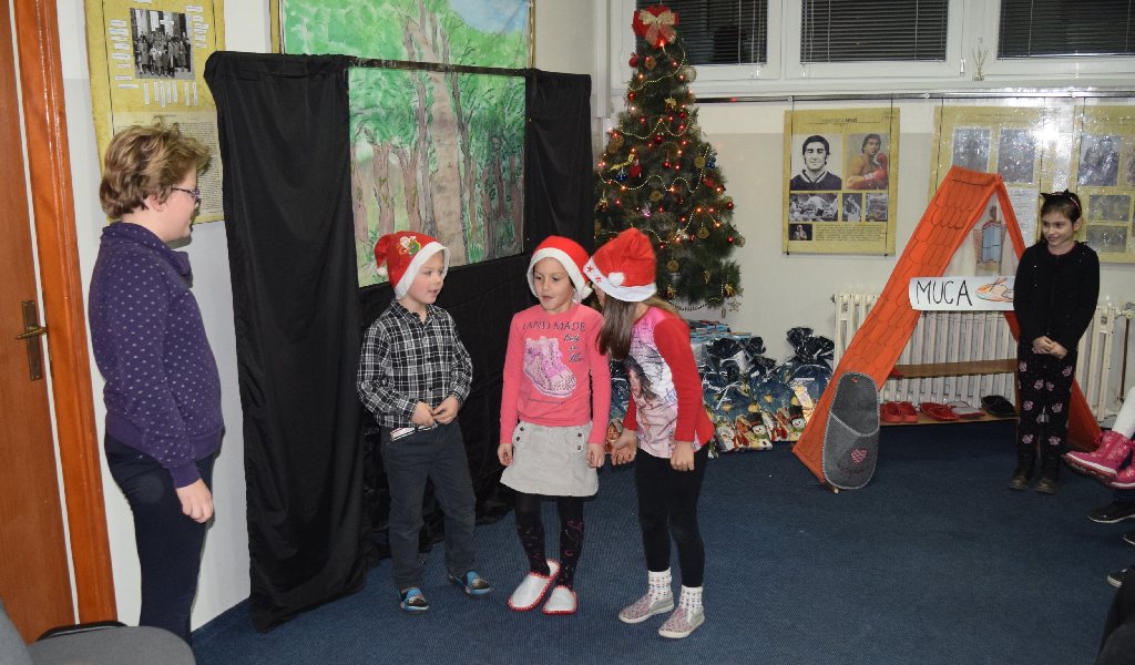On Wednesday, 14 December, the Christmas tree on the premises of the National Minorities' Club has already been decorated and children were impatient to see who left presents under the tree. Before we called for Santa Claus, we watched a puppet play “Sapramiška” and plays The Slipper Cat and Grateful Statues. The puppet play about a mouse who broke her tooth was performed by pupils of supply teaching lessons from Slatina. The mouse became brave and went to a dentist and that is why we, at the end of the play, all sang a song “My white teeth”. New generations of children grow along the Sapramiška fairytale and as favourite as the brave mouse is the one about a cat which takes children’s slippers if they do not tidy them up. The Slipper Cat play was performed by our youngest pupils while elder pupils performed Grateful Statues.