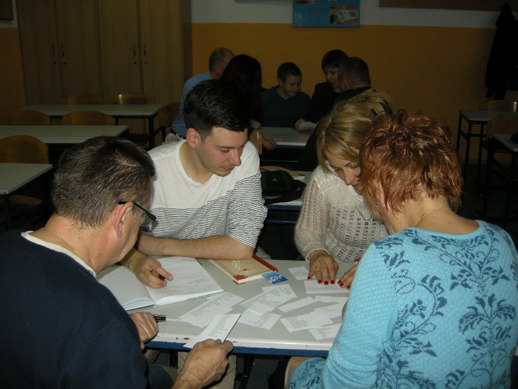 A message on the occasion of 2 April was prepared by Russian section of International Board on Books for Young People. Author Sergey Makhotin entitled it “Let us grow with the book”. We read the message as an introduction to the Book Night. We designed the event as inter-generational reading, the youngest reader was a pupil, and the eldest reader a retired lady. Pupils and students got cut-through poems by Saša Vegri, and worked in groups to identify the right titles of poems and put them as a whole. In the collection of poems “Armful of stones” they selected poems that made the strongest impression on them at first reading – some because of the message they carry, others because of humour, play of words and gentleness. Each person decided for one and presented it. Poems by Saša Vegri address the readers of different age, and that is why they were a great choice for inter-generational reading. Thank you to the association Reader’s Badge of Slovenia that presented the books to us. Therefore, the pupils and students of supply teaching lessons of Slovenian will have further possibilities of enjoying good poetry.