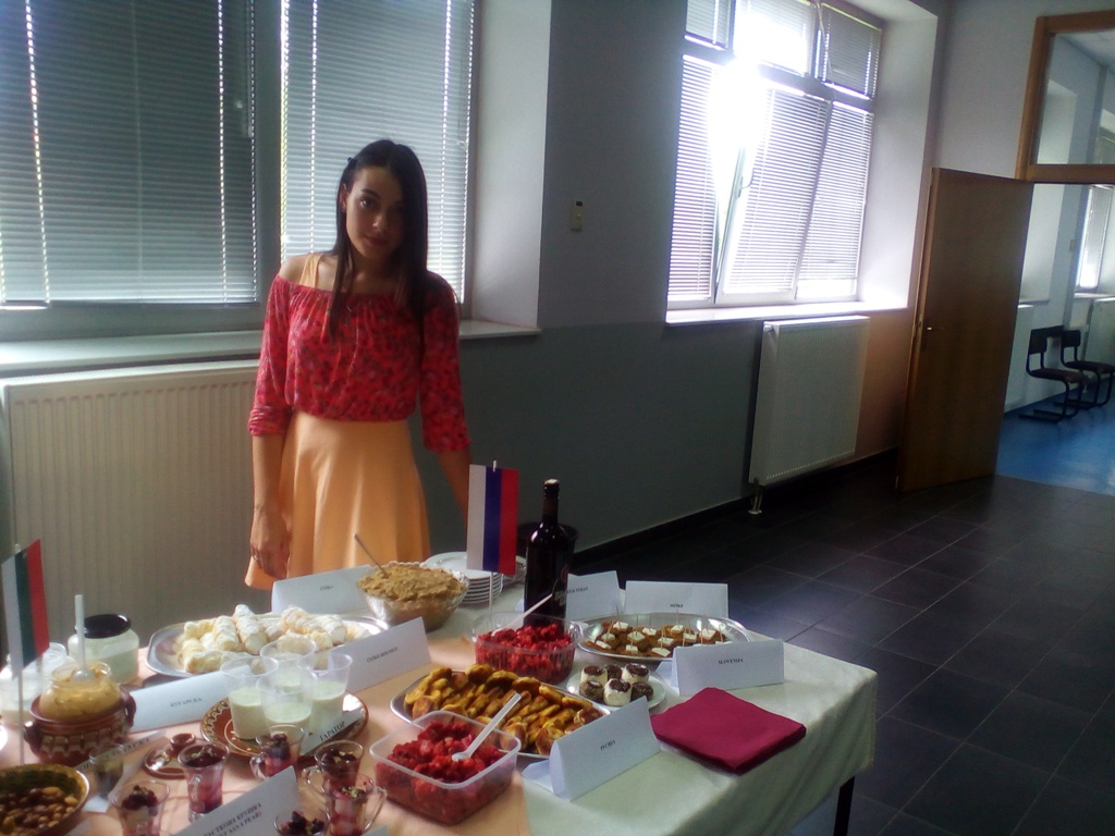 Slovenian food was prepared by Biljana and Anđela Babić. Professor Biljana Babić, PhD, teaches history of the Serbian language and Serbian-Slovenian language parallels at the Faculty of Philology and Faculty of Philosophy. Anđela Babić is the student of the final year and this is her second year of attending supply teaching lessons of Slovenian language and culture. Last summer they attended summer school Hello, this is Slovenian Mediterranean organised by University of Primorska. During afternoon activities there was a culinary workshop where Anđela learned how to prepare »mice«, and that is why they prepared this favourite meal known in different parts of Slovenia for the Faculty Day. Well decorated tables had, beside „mice“ and Teran liqueur, Russian caps, Czech bundles, Bulgarian cold soup, Vienna steak and other meals representing the culture of peoples whose languages they teach.