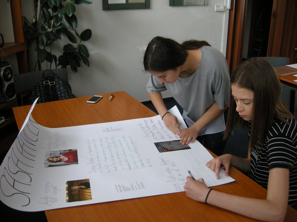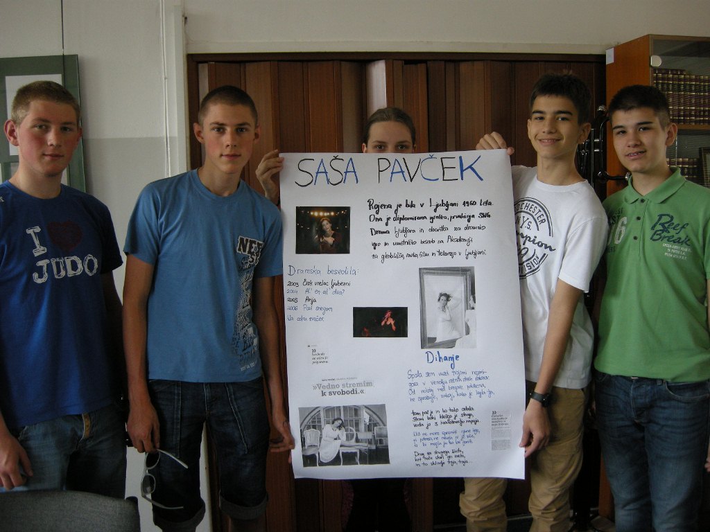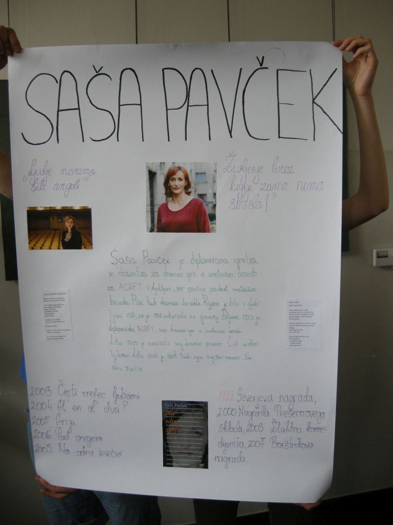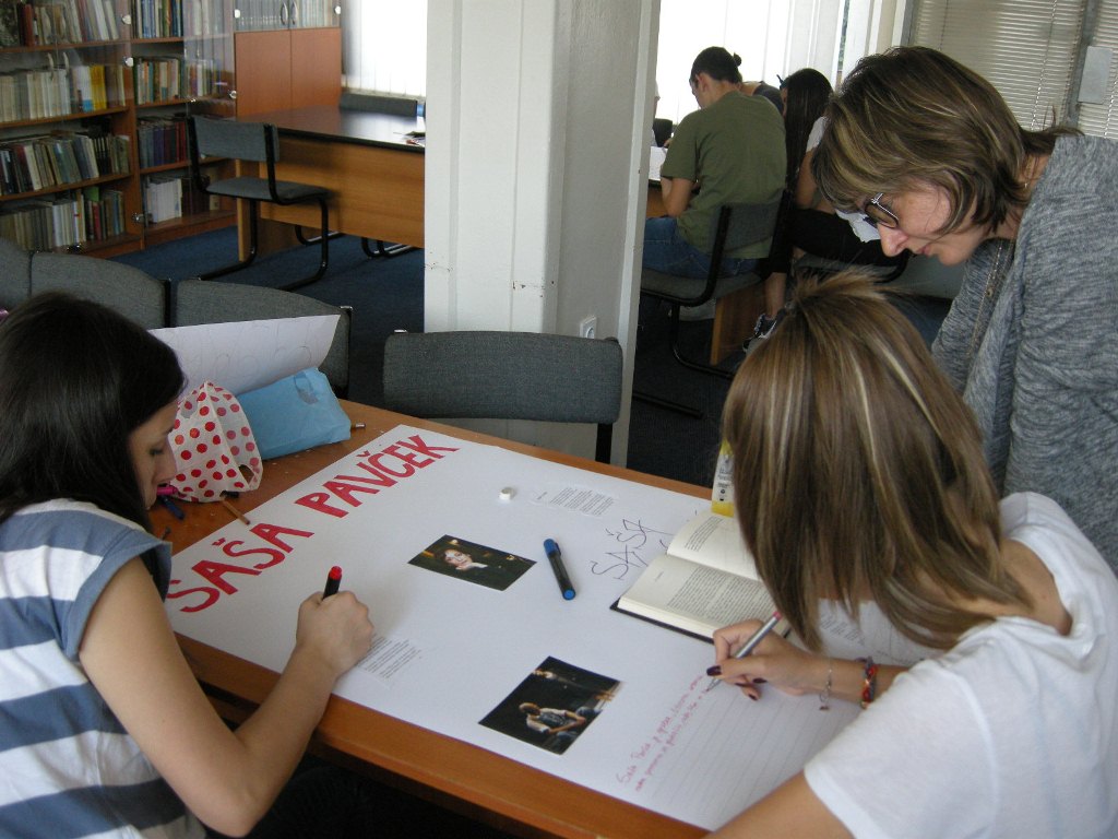 At the supply teaching lessons we were preparing for her visit. The adults read interviews and listened to her interpretation of own poems on CD Dress me in a Kiss. The youngest learned about her fairy-tale Why is the field a lake. Pupils and students prepared posters expressing their view of creativity of Saša Pavček. They looked at her books and interviews, and then they wrote, drew, painted, cut, glued… Posters will wait for the artist on Saturday at the National Minorities’ Club while the photographs show how impressed pupils and students were during their work.