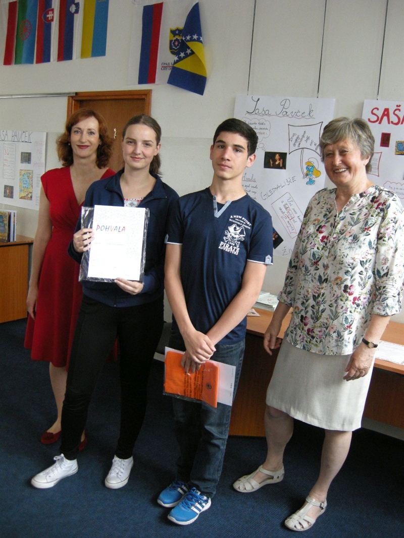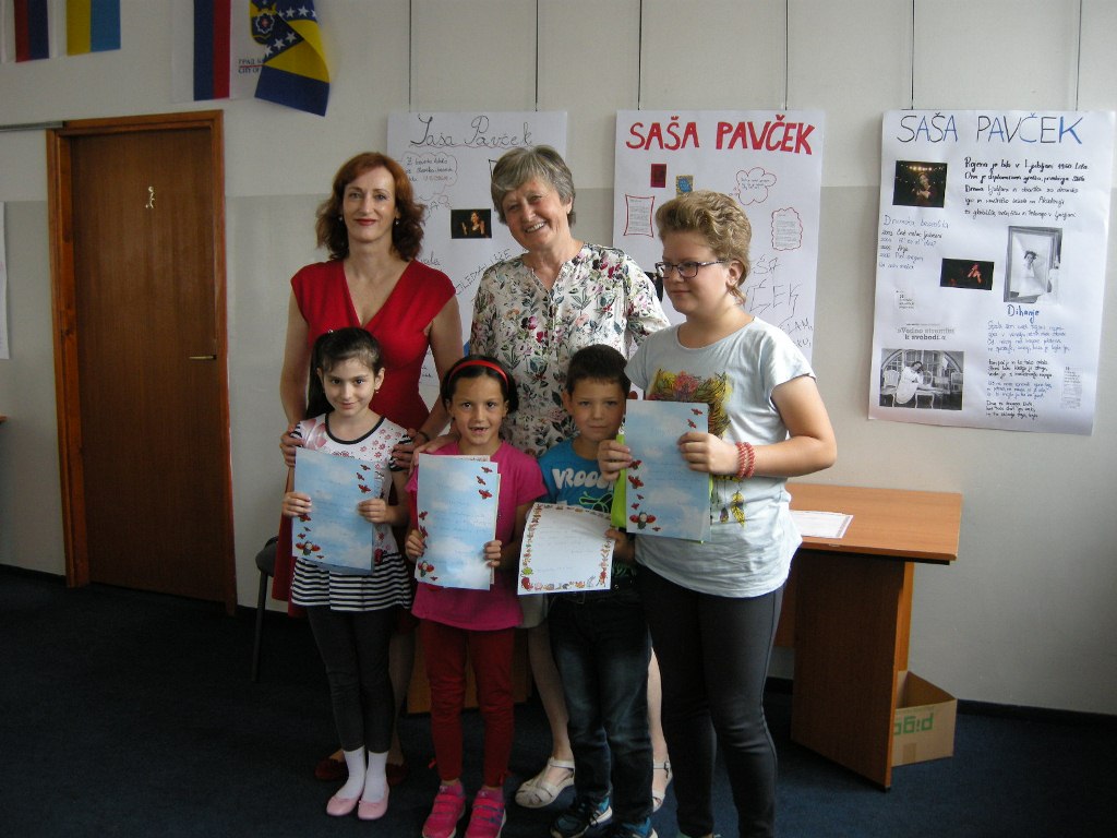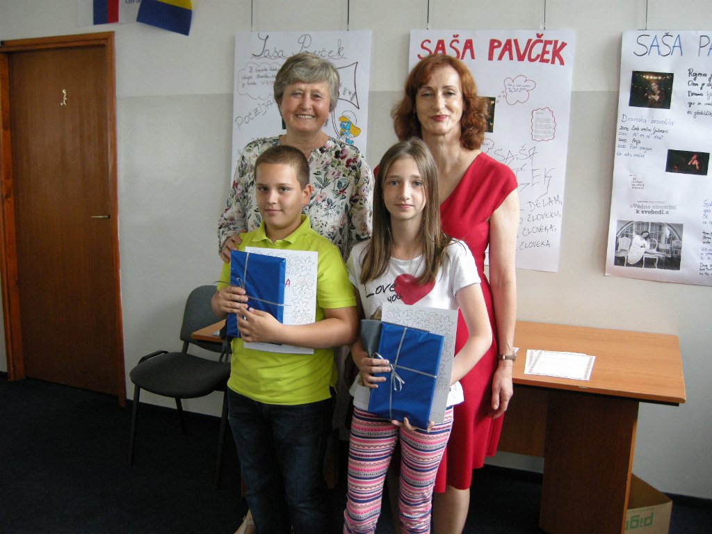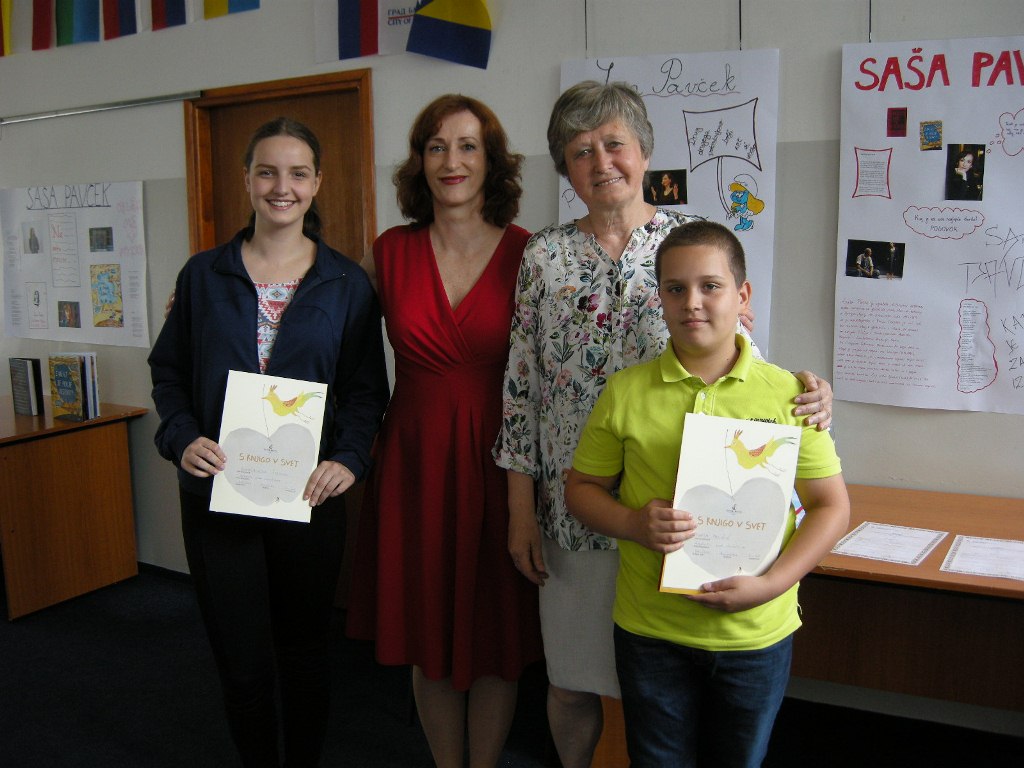 Saša Pavček teaches at the Academy for Theatre, Radio, Film and TV, and she clearly presented to pupils her pedagogical work. She spoke about her writing, and then it was the time to award certificates. The youngest pupils deserved special praise for regular attendance and active learning. Three acknowledgments were awarded for regular attendance: Aleksandra Špehar and Elena Lunić did not miss a single class, while Viktor Perušić was the boy who most often attended classes. Reader's badge this year went to Nikša Perušić and Aleksandra Špehar, and they also received acknowledgement and books. Nikša Perušić and Jelena Sibinović received acknowledgement and book award of the City Library of Ljubljana, where their art works had been selected among top ten at the competition Underwater World.