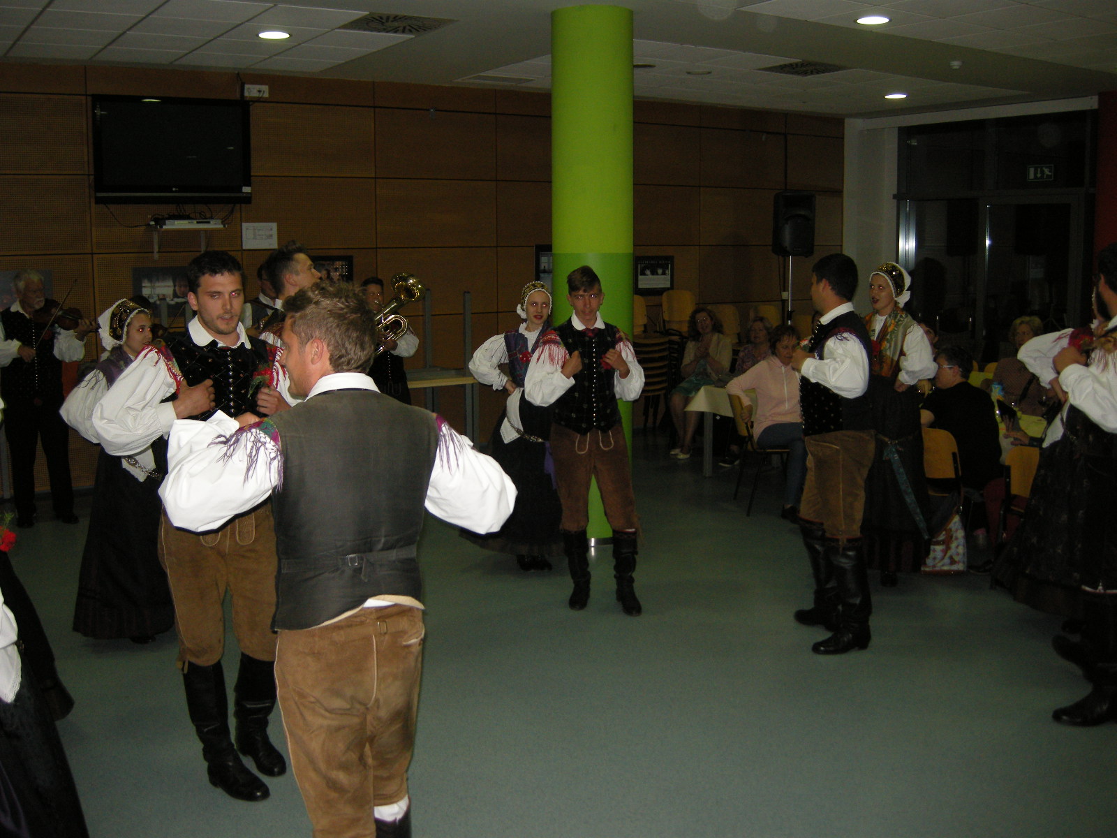 Cooperation with our hosts in Kranj will continue while on Friday evening we had a chance to get to know them better. In Grammar School France Prešeren they prepared us dinner and cultural programme. Folklore group Iskraemeco made performance. They showed us dances of Gorenjska and explained parts of national costume of Gorenjska. They taught us dance of Bela Krajina and made us all laugh with the old folk game of hat exchange. Competitors take the hat from neighbour’s head and put it on own head. This is all done in the rhythm of music. When one of the competitors is out of the rhythm he/she is also out of the game. Members of Association Triglav tried the fun game, too. Excursions always bring new experience and events we will never forget. There also remains memory of beautiful buildings, area and stories of people who live there.