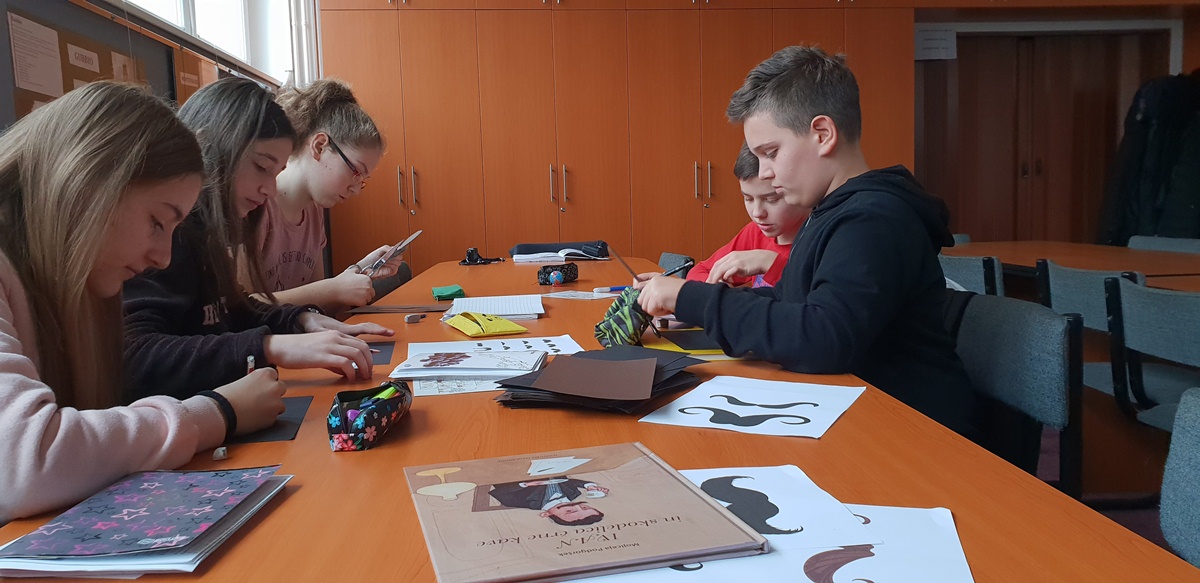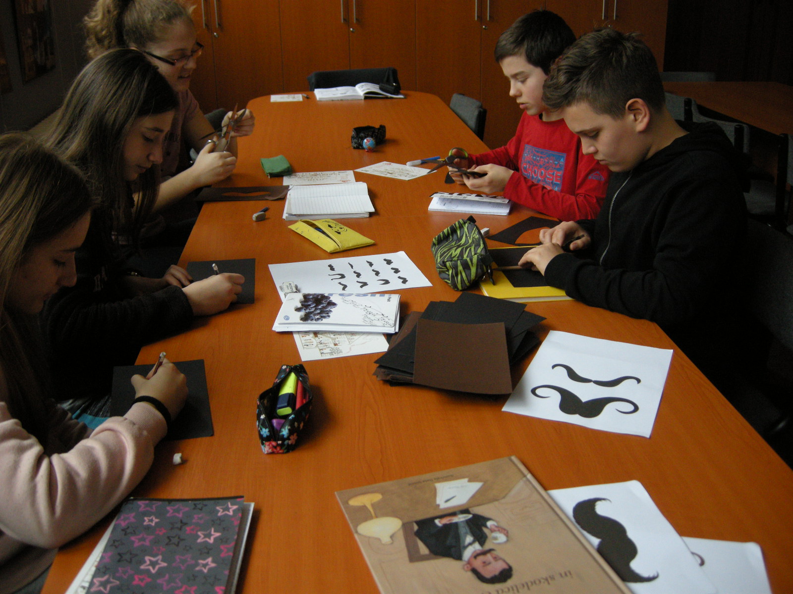 Programme Library – Universe of Treasure was a part of the project Cankar’s Days. This year is Cankar’s year as we mark 100 years of death of Ivan Cankar. Katja Bevk read a picture book Ivan and a cup of black coffee and spoke about his life, whereupon pupils and students made bookmarks. And given that Ivan Cankar had moustache and bookmarks were also in the form of moustache.