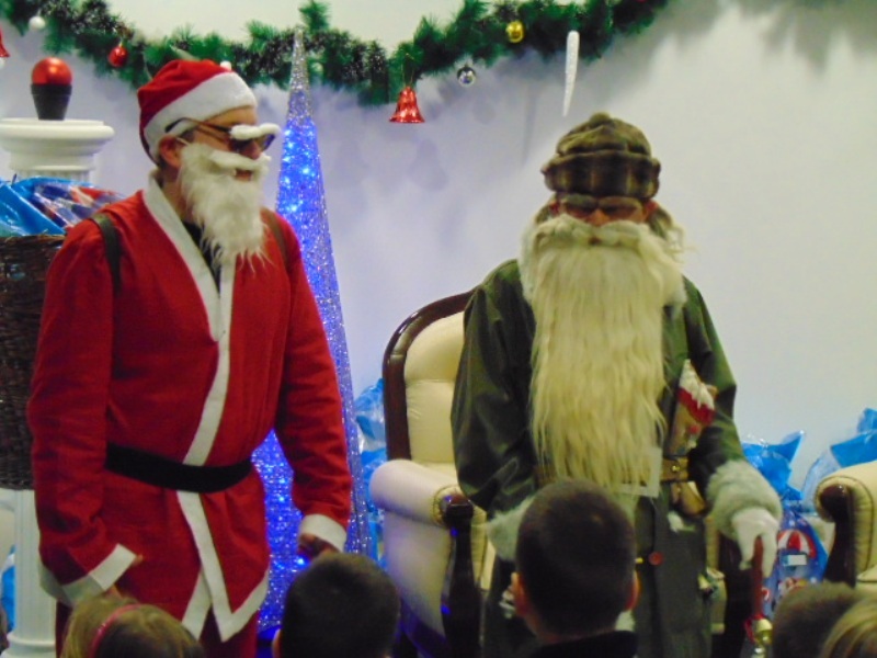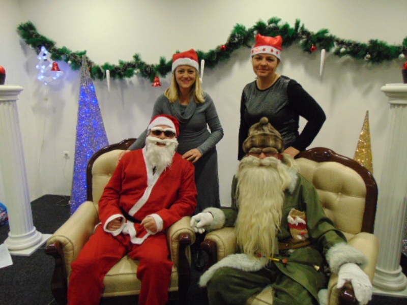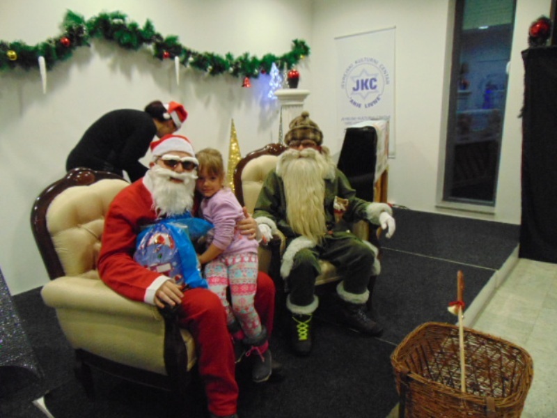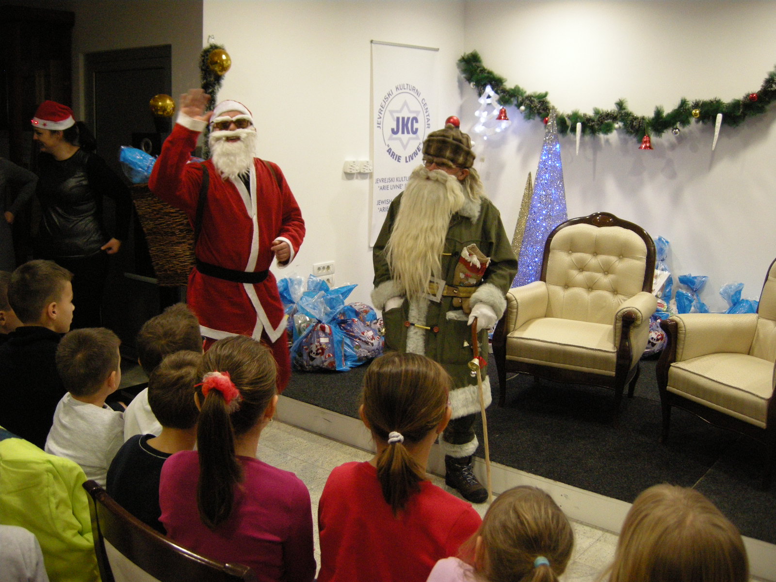 On Friday, 14 December, it was snowing the whole day. Children waited for them in Jewish Cultural Centre. Melody of saxophone played by Jovan Dimitrijević, marked the start of the event. Programme was presented by Elena Lunić. The first to perform were three pupils from Slatina. They played a puppet play A Rabbit Got Lost. Then followed our youngest pupils. Although they started learning Slovenian this school year they were brave enough to get to the stage. Butterflies, flowers, the sun and cloud were in the Four Butterflies. Pupils attending classes on Saturdays played a fairy tale How Ana and Bojan travelled to the city or You can never please everyone. After the programme we called for Santa Claus. He did not come alone but in the company of Father Christmas and with a basket full of presents. Those are the moments that children always remember and to remind them of magical time of childhood.
