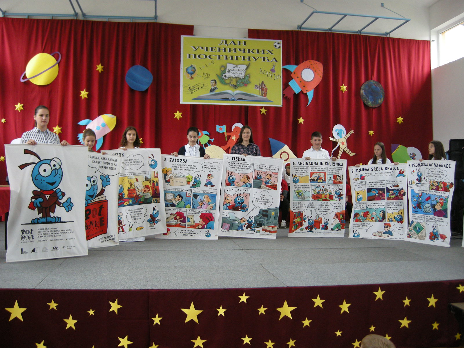 Pupils showing what they have learned include also pupils of supply teaching lessons of Slovenian. This year, they introduced the book project to their peers. The host of the project, implemented by the Slovenian Book Agency, was the Association of Slovenians Triglav in Banja Luka back in February. We liked the book moth so much teaching us how to make a book, that we borrowed posters again. The students presented the process of making the book, discussed the role of the author, the publishing house, the printing press, as well as all those who ensure that the book reaches the reader. If no one reads it, the book is just a subject, and that's why the role of libraries and bookstores is huge. Teachers want pupils and students to fall in love with books. A nice tale of a book moth, written by Žiga X. Gombač and illustrated by David Krančan, helps us promote reading. The students of the supply teaching lessons of Slovenian invited their peers to visit the bibliobus, which is the first library-bus in Bosnia and Herzegovina. The position is in front of the Primary School “Holandija”. The moth says, "Those who read, strengthen their vocabulary, and with each page read, we learn something new and we are never bored." and all of us who attended the event listened to the pupils of Primary School “Holandija” because the program was excellent.
