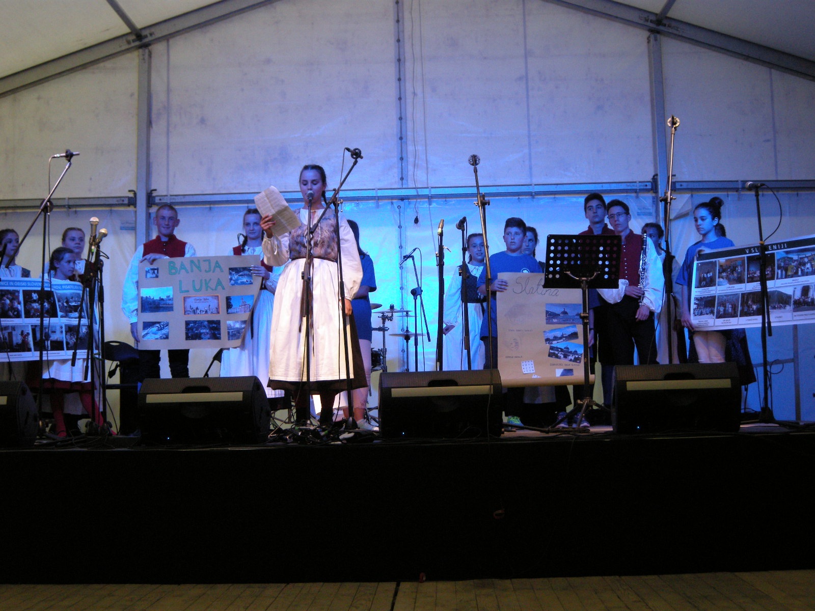 Members of the Association of Slovenians Triglav always visit the Welcome Home event. They presented their newsletters and bilingual books on a stand at City Park and invited visitors to solve a quiz What do you know about Slovenia? Many passers-by showed their knowledge, had an apple cake and talked to the students of supply teaching lessons of Slovenian from Slatina, who organized the quiz. The cultural program began with the address of Karla Urh, Mayor of Radovljica, Ciril Globocnik and Vice-President of the National Assembly Commission for Relations with Slovenians Abroad. Minister for Slovenians worldwide, Peter Jozef Česnik, also welcomed the gathering and stressed that he had been an expatriate for more than three decades. On behalf of the President of the Republic, Borut Pahor, the speech was given by Academician Boštjan Žeks, who was himself Minister for Slovenians Abroad. The first to perform were young people from Argentina, followed by Slovenians from Sweden and other European countries. The youngest were performers from Banja Luka and Slatina. Members of the folklore group of the Association of Slovenians Triglav danced, and students of supply teaching lessons of Slovenian presented the work of the Association and their thoughts on the homeland. Since the Association is called Triglav and because they performed among the mountains, the performance ended with the song Na planincah.