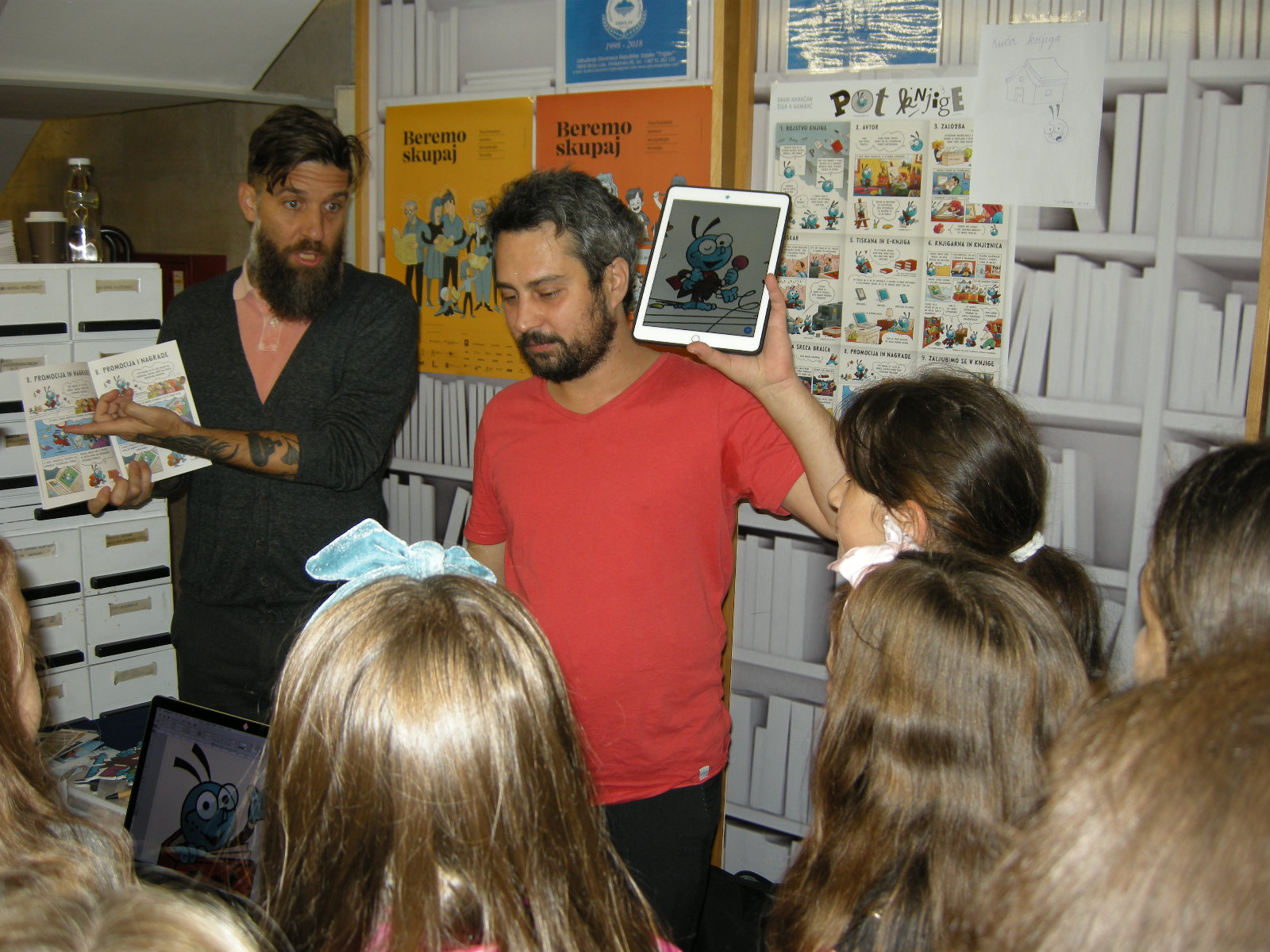 The Journey of a Book was presented in the morning at the Language Fair at the National and University Library in Banja Luka. We were the first to be visited by 5th grade elementary school pupils of Elementary School Branko Radičević with teacher Vanja Perić. The authors Žiga X Gombač and David Krančan presented the journey of the book from the author to the reader, while the students handled the worksheets. Throughout the afternoon, the two authors met with young readers who eagerly listened to the stories of the book moth. The Slovenian authors performed in the afternoon at an event that brought together speakers of ten European languages at the National and University Library: Serbian, German, English, French, Russian, Greek, Spanish, Italian, Czech and Slovenian. The aim of the European Languages Day is to emphasize the importance of multilingualism, and one of the languages heard at the events in Banja Luka is Slovenian.