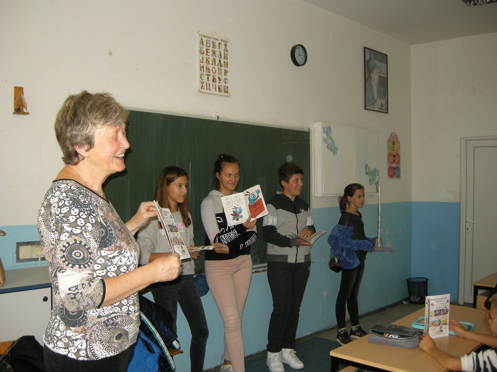The mascot, which tells us how the book was made, came from Ljubljana - from the Public Book Agency of Slovenia, so he spoke Slovenian. The students of the supply teaching lessons of Slovenian Katja, Gabriel, Lucius and Stefan translated his story into Serbian. The story is written in the comic book The Journey of a Book, written by Žiga X Gombač and illustrated by David Krančan. The Association of Slovenians Triglav Banja Luka made sure that students who do not understand Slovenian now have a bilingual edition of this booklet.