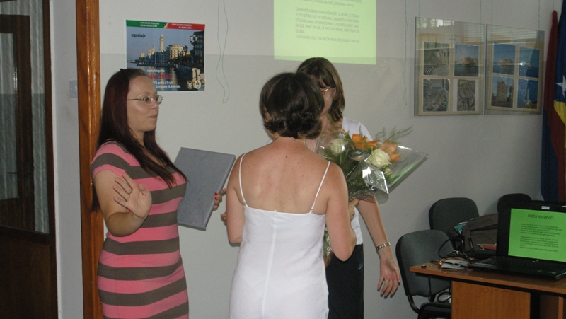 S fotografijo in besedo smo se sprehodili po dejavnostih v šolskem letu 2011/2012, potem pa sem učencem podelila potrdila in zahvale, nekaterim starejšim pa še teste. V skupini najmlajših sem še posebej izpostavila mlada zanesenjaka Vikotrja Perušića in Aleksandro Špehar, ki sta bila zelo redna obiskovalca dopolnilnega pouka in ki sta bila najbolj zavzeta udeleženca vseh obšolskih dejavnosti. V drugi skupini, ki je dopolnilni pouk slovenščine (DPS) obiskovala ob sobotah od devetih do pol enajstih, so po pridnosti in napredku pri učenju slovenščine zagotovo izstopali fantje, to so Mihael Cucek ter brata Aleksandar in Rastko Zrnić. Ivana Lujić se slovenščino uči tri leta in si zasluži pohvalo za zavzeto in odgovorno delo pri DPS, prav tako pa Darko Đukić, ki je začel obiskovati DPS to šolsko leto in ki je pokazal zagotovo največ volje za učenje jezika in vsega, povezanega s Slovenijo. V skupini nadaljevalcev so si priznanje za zelo dobro znanje slovenščine zaslužili Jovana Dimitrijević, Vanja Prosen, Marina Šopalović in Borka Srdić, za zelo reden obisk pa tudi Aleksandra Rogić. V skupini odraslih pa sem za zavzeto delo in reden obisk še posebej pohvalila Marijo Petković ter Evelina in Dušico Drinić.