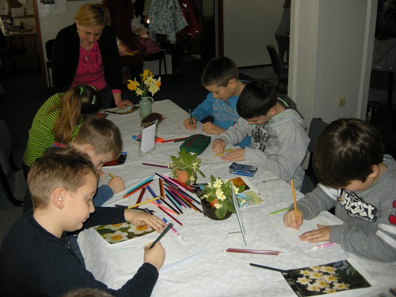 Spomladi se narava prebuja. V vseh kulturah ima to obdobje velik pomen. Velika noč, največji in najstarejši krščanski praznik, je hkrati tudi praznik pomladi in hvalnica novemu življenju. Učenci dopolnilnega pouka slovenščine iz Banjaluke in Slatine so na ustvarjalnih delavnicah izdelovali to, na kar ob besedi pomlad običajno pomislimo. Prve asociacije so povezane s cvetlicami. Viktor je prinesel narcise in trobentice in vsak otrok je naslikal svojo sliko z motivom pomladnih rož. Slike so dali v okvir. To delavnico je vodila Alenka, Vikijeva in Nikševa mama.