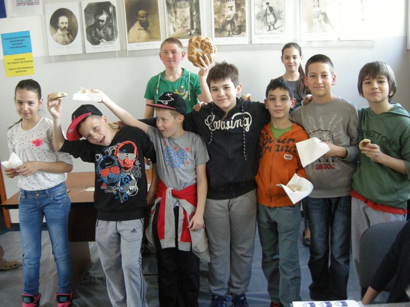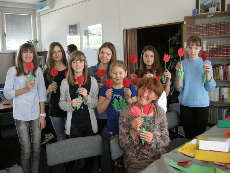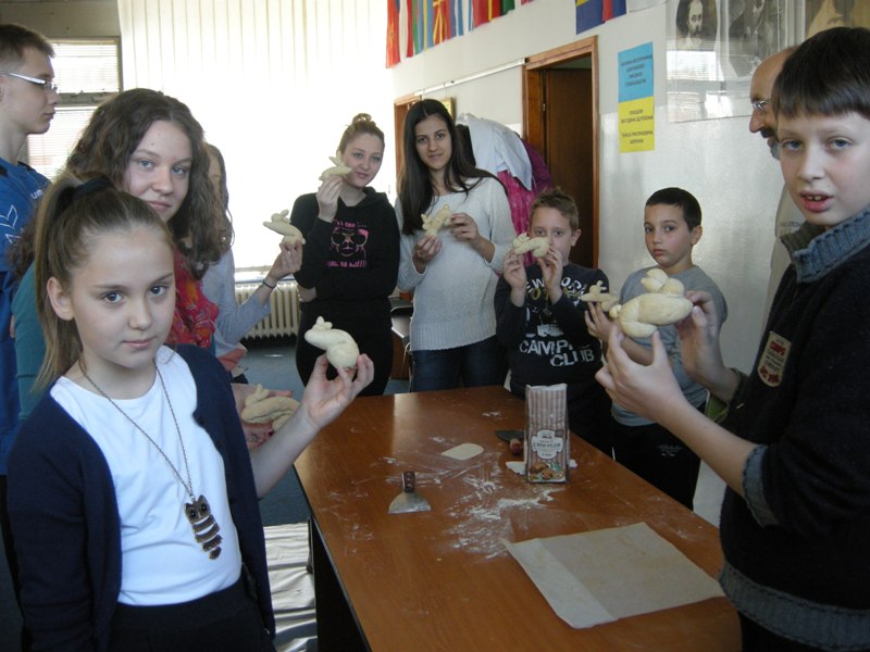 Od 9.30 do 12.30 so potekale pomladne delavnice. Aleksandra in Ivana sta otroke naučili, kako plesti zapestnice, Bojana Bošnjak, gostja iz Ljubljane, je z njimi izdelovala rože iz papirja, Franci pa jim je pokazal, kako iz testa plesti pletenice. Oblikovali so tudi zajčke in ptičke, svoje izdelke pa so seveda tudi spekli. Vsak otrok je narisal slovensko zastavo, na hrbtno stran lista pa samega sebe. Te risbe, rože iz papirja in zapestnice bomo poslali v Novo Gorico, kjer Nina Nemec vodi projekt Vse najboljše, Slovenija. Naše risbe in izdelke bo poslala Slovencem po svetu, mi pa bomo dobili njihove risbe in izdelke. Tudi s takimi projekti dokazujemo, da ustvarjalne dejavnosti lahko povezujejo Slovence, ki živijo v bolj in manj oddaljenih državah.