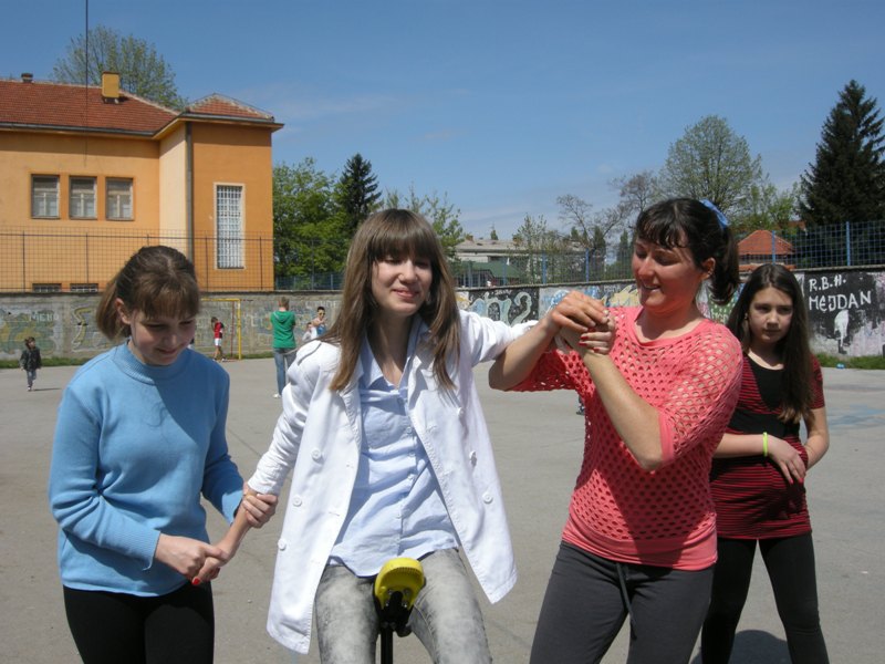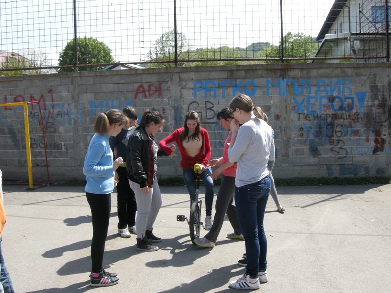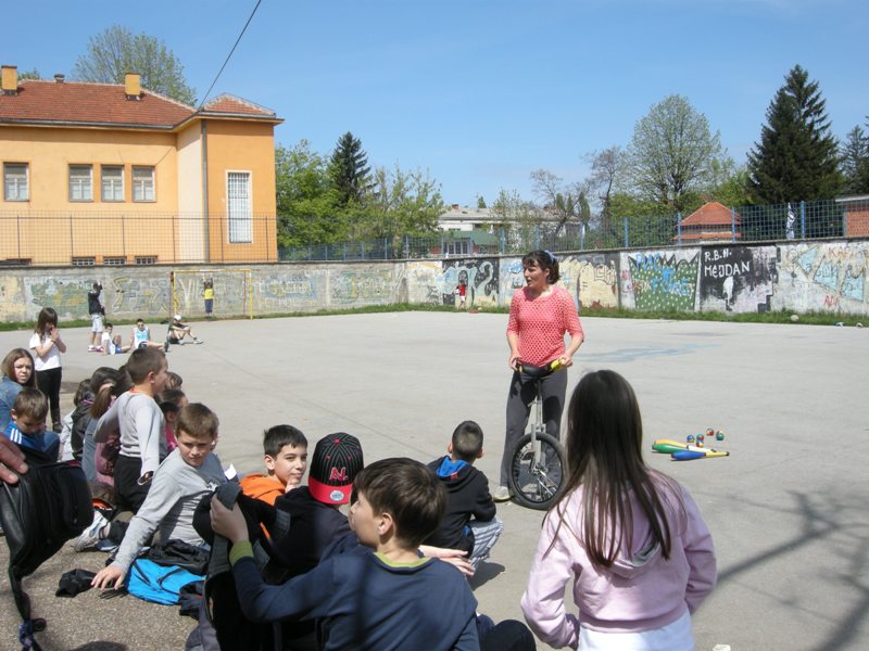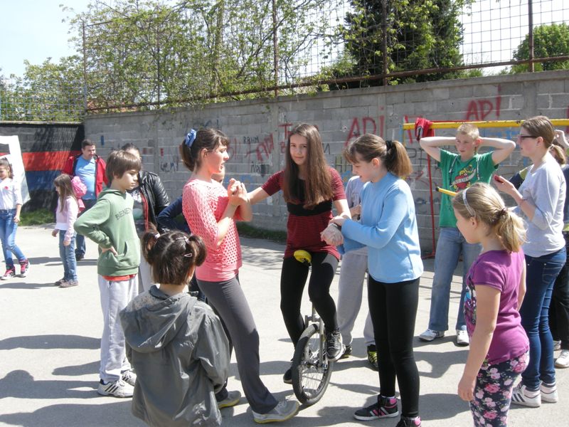 Po ustvarjalnih delavnicah smo imeli na športnem igrišču pred bližnjo šolo prikaz vožnje z monociklom in žongliranja. Učenci so se pod vodstvom Anje Bošnjak, gostje iz Ljubljane, tudi sami preskusili v vožnji z monociklom. Le poglejte na fotografijah, kako pogumni so bili!