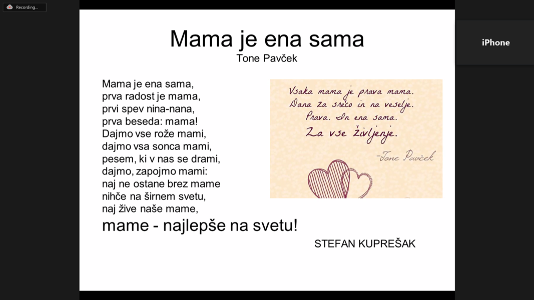 Program smo začeli s pesmimi o mamah. Prvo je povedala naša najmlajša učenka Marija Mihajlović. Med avtoricami pesmi smo posebej izpostavili Nežo Maurer, z izborom njenih pesmi smo ji voščili za 90. rojstni dan.