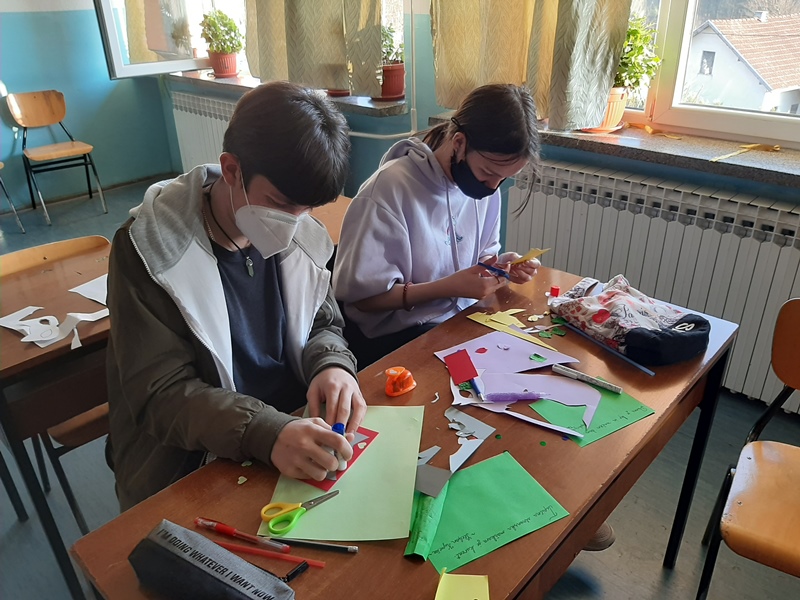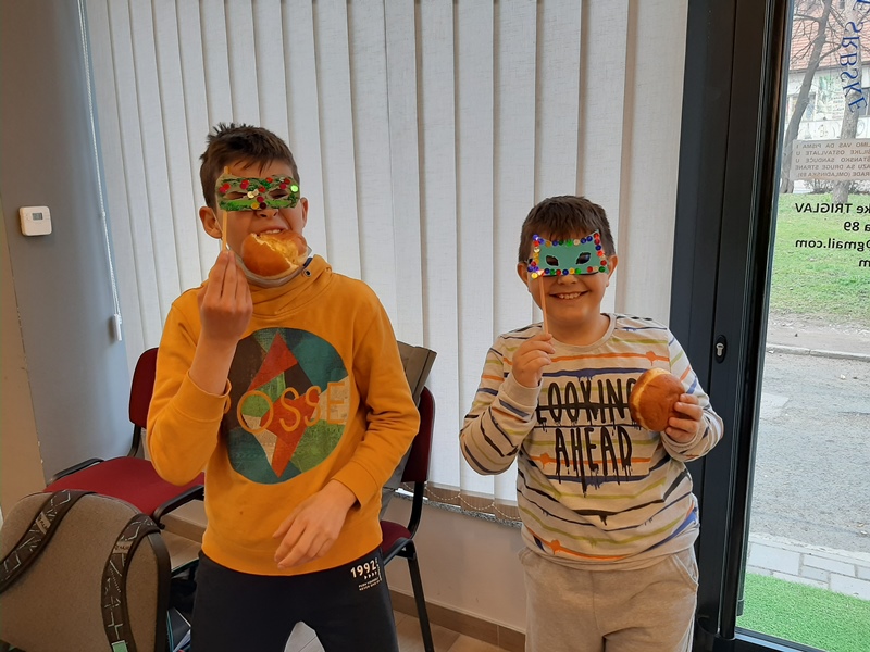 Izdelali smo tudi pustne maske in tako prinesli pust v Bosno in Hercegovino. Seveda niso manjkali tudi krofi, s katerimi smo se posladkali ob koncu pouka. Maškare so potrkale na vrata in vprašale: »Imate kaj za pusta hrusta?« Obdarili smo jih s sladkarijami in, kot se spodobi za pust, z mastnimi krofi.
