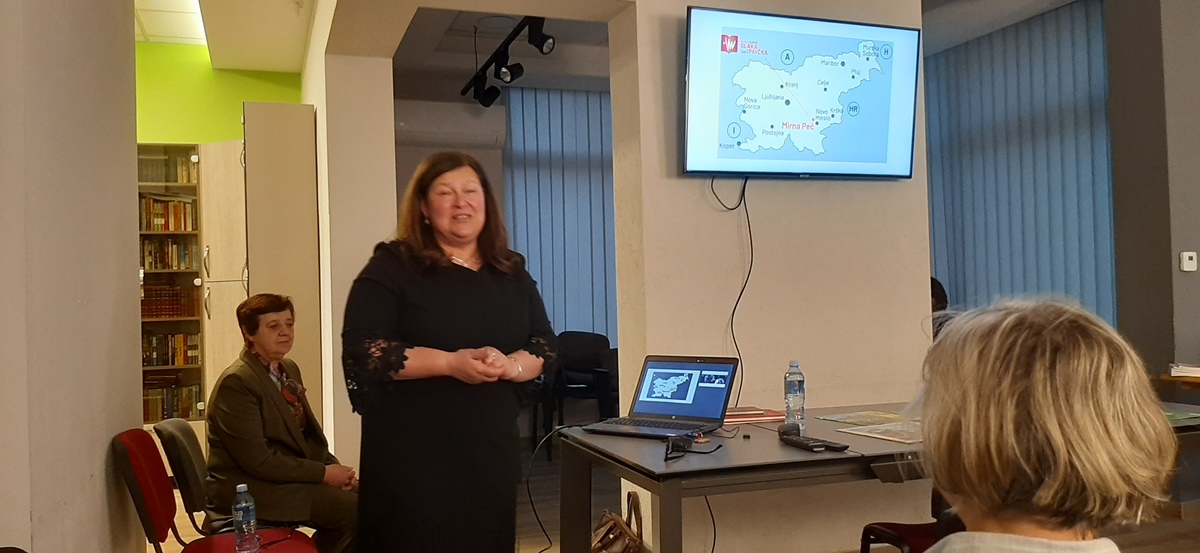 Popoldne je bila na povabilo in v organizaciji učiteljice dopolnilnega pouka slovenščine predstavitev Muzeja Lojzeta Slaka in Toneta Pavčka iz Mirne Peči. Vodja muzeja Ljudmila Bajc in strokovna sodelavka Mojca Lužar sta predstavili muzej, življenje in delo znanih Mirnopečanov, ob koncu srečanja pa so udeleženci zapeli slakovi pesmi Čebelar in V dolini tihi. Manjkala ni niti slovenska potica, poskusili pa smo tudi dolenjski cviček. Prijetno druženje smo zaključili s poslušanjem pesmi Lojzeta Slaka.