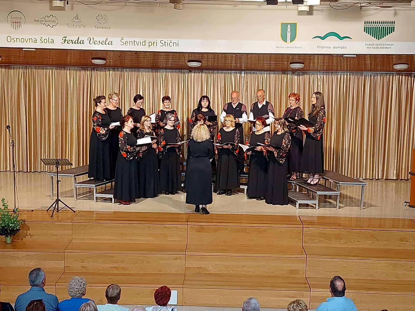 Po sprehodu skozi preteklost smo pevci nadaljevali pot do cilja oz. proti Šentvidu, kje smo nastopili z drugimi slovenskimi zbori iz Srbije, Madžarske, Italije in seveda Slovenije. Pevski zbor »Davorin Jenko« pod taktirko mag. Vanje Topić Vještica je nastopil že 18. zapored s tremi pesmimi Mari mome, Lepa Nera in Mlade oči. Publika, ki se je 17.6. zbrala v O.Š. »Ferda Vesela« dobro pozna glasbeno pot našega zbora in nas vedno znova nagradi z bučnim aplavzom in neprikritimi simpatijami.
