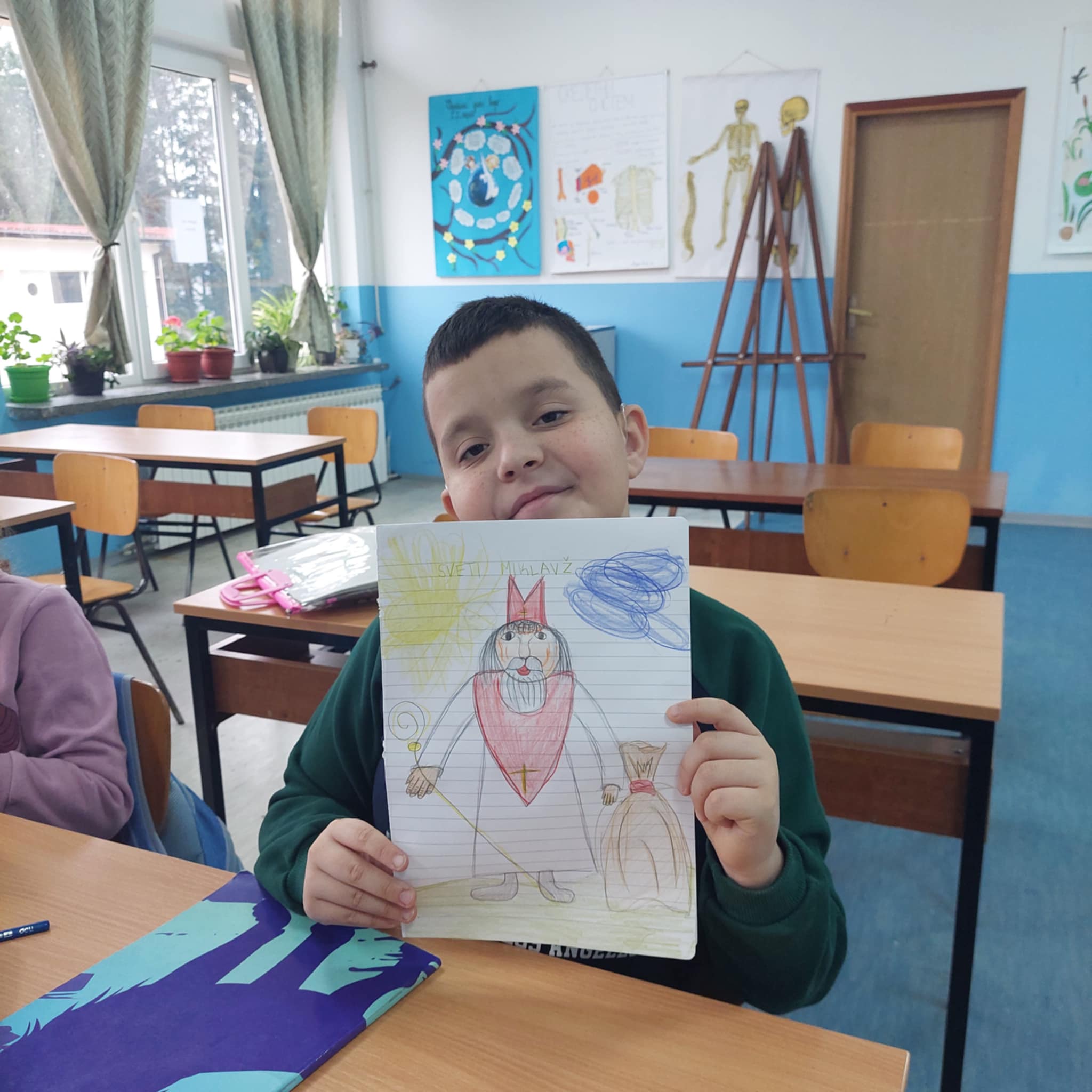 Sveti Miklavž obišče slovenske otroke s 5. na 6. december zvečer. Zato sem okrog tega datuma za učence – osnovnošolce pripravila prav posebne ure dopolnilnega pouka, povezane z miklavževanjem. Tako smo s starejšimi osnovnošolci prebrali splet legend o svetem Nikolaju in poiskali podobnosti z legendami o svetem Martinu. Oba sta namreč po čudnem spletu okoliščin postala dobrodelna in čudodelna škofa, dobrotnika in zavetnika številnim raznolikim skupinam ljudi. Učenci so z velikim zanimanjem poslušali, kako je sveti Miklavž postal dobri decembrski mož in kako sta se mu pridružila do konca leta še dva, Božiček in dedek Mraz. Seveda je učence zanimalo, kdo so Miklavževi spremljevalci, ki se imenujejo parkeljni. Na preprost način sem jim pojasnila, da so vražički ob Miklavžu ostanki poganskih časov, ko so v tem poznojesenskem obdobju v dolgih nočeh obiskovali zemljo dobri duhovi, a jih je kasneje krščanstvo spremenilo v hudobce iz pekla, ki spremljajo Miklavža in mu pomagajo pokoriti poredne otroke. V novejšem času so bili dodani tudi angelčki, ki morda malce ublažijo podobo strašljivih pošasti – parkeljnov. Z manjšimi osnovnošolci pa smo pobarvali svetega Miklavža, parkeljna in angela, popeljali Miklavža skozi zapleten labirint do prijazne hiške, v kateri ga čakajo otroci, in se naučili prikupno pesmico o Miklavžu. V Slatini so prvošolčki prav tako spoznali Miklavža preko prikupne didaktične igre. Nastja in Srećko pa sta prav mojstrsko upodobila Miklavža.
