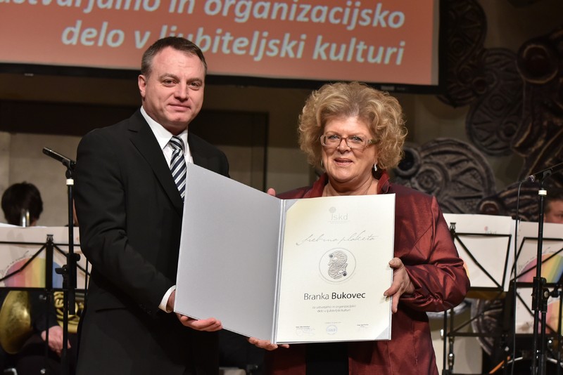 Javni sklad RS za kulturne dejavnosti podelil priznanja za življenjsko delo in izjemne dosežke na področju ljubiteljske kulture. Srebrno plaketo je na včerajšnji slovesnosti v Ljubljani prejela sekretarka Društva za razvijanje prostovoljnega dela Novo mesto, Branka Bukovec. Čestitamo!