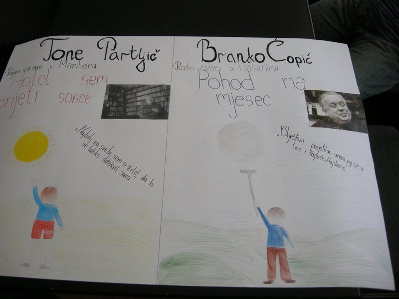 Tone Partljič piše črtice, novele, romane in dramska dela. Odrasli udeleženci dopolnilnega pouka slovenščine so si ogledali film Moj ata, socialistični kulak, ki je posnet po njegovem scenariju, otroci in odrasli smo spoznali njegove zgodbe iz otroštva, zbrane v knjigi Hotel sem prijeti sonce, in odlomek dramskega dela Ščuke pa ni. Osnovnošolci in srednješolci so izdelali zanimive plakate, poiskali so tudi vzporednice med delom Branka Čopića in Toneta Partljiča. Tone Partljič je letošnji dobitnik Prešernove nagrade, najpomembnejše slovenske nagrade s področja umetnosti. Je odličen komediograf, nekateri ga imenujejo »mojster za smeh«, zaslovel je s satiričnimi dramami o sodobnem življenju, mi pa smo ga spoznali tudi kot tenkočutnega pisca spominov iz otroštva.