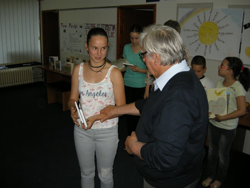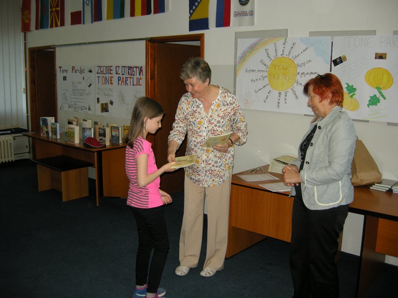 Gosta zaključne prireditve sta bila slovenski pisatelj Tone Partljič in direktorica Knjižnice Antona Tomaža Linharta Božena Kolman Finžgar. Tone Partljič je odličen pripovedovalec, zato sta bila oba večera, ki ju je preživel z nami, polna zanimivih zgodb in humorja. Vsako leto vidimo, da obiski ustvarjalcev puščajo sledi, in prepričano smo, da bo tako tudi letos. Otroci so uživali ob poslušanju, najbolj zabavno je bilo, ko so se mu pridružili pri gledaliških improvizacijah. Učenci so prejeli potrdila in pohvale, tisti, ki so pridno brali, so dobili tudi knjižne nagrade. Največ knjig je prebrala osmošolka Aleksandra Špehar, zato ji je Božena Kolman Finžgar podarila nagrado za sodelovanje v projektu Knjižnica – vesolje zakladov. Aleksandra Špehar, Ana Cucek in Nikša Perušič v tem šolskem letu niso niti enkrat manjkali pri pouku, zato so prejeli še posebne nagrade.