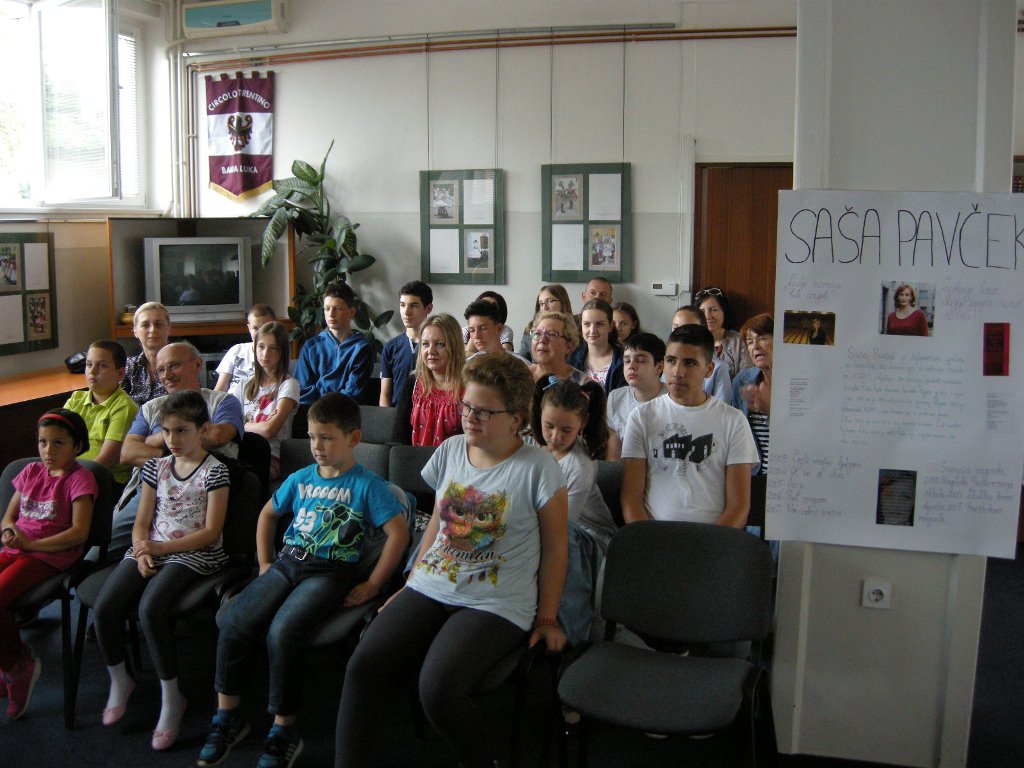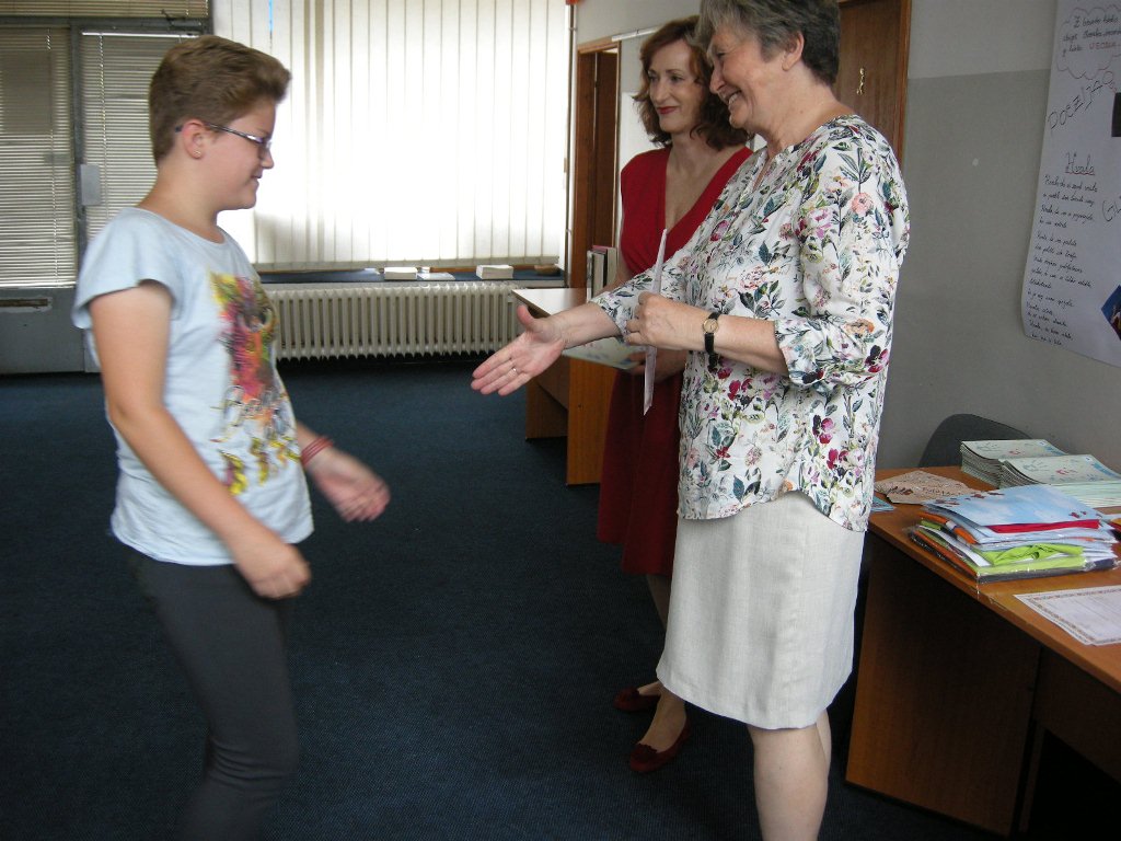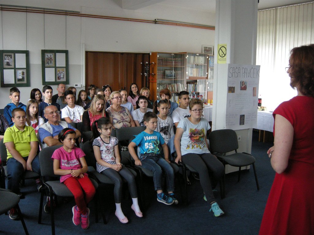 Saša Pavček poučuje na Akademiji za gledališče, radio, film in televizijo, učencem je nazorno predstavila svoje pedagoško delo. Spregovorila je še o svojem pisanju, potem pa je bil že čas za podelitev potrdil. Najmlajši učenci so si prislužili posebne pohvale za redno obiskovanje pouka in za pridno učenje. Tudi mladostnikom smo podelili tri pohvale za prisotnost: Aleksandra Špehar in Elena Lunić nista v vsem šolskem letu manjkali niti enkrat, med fanti pa je bil največkrat pri pouku Viktor Perušić. Bralno značko sta letos osvojila Nikša Perušić in Aleksandra Špehar, dobila sta priznanje in knjigo. Nikša Perušić in Jelena Sibinović sta prejela priznanje in knjižno nagrado Mestne knjižnice Ljubljana, ker sta bili njuni likovni deli na natečaju Podvodni svet izbrani med deset najboljših.