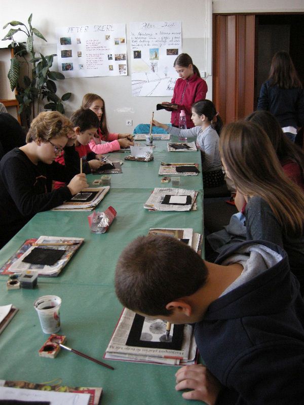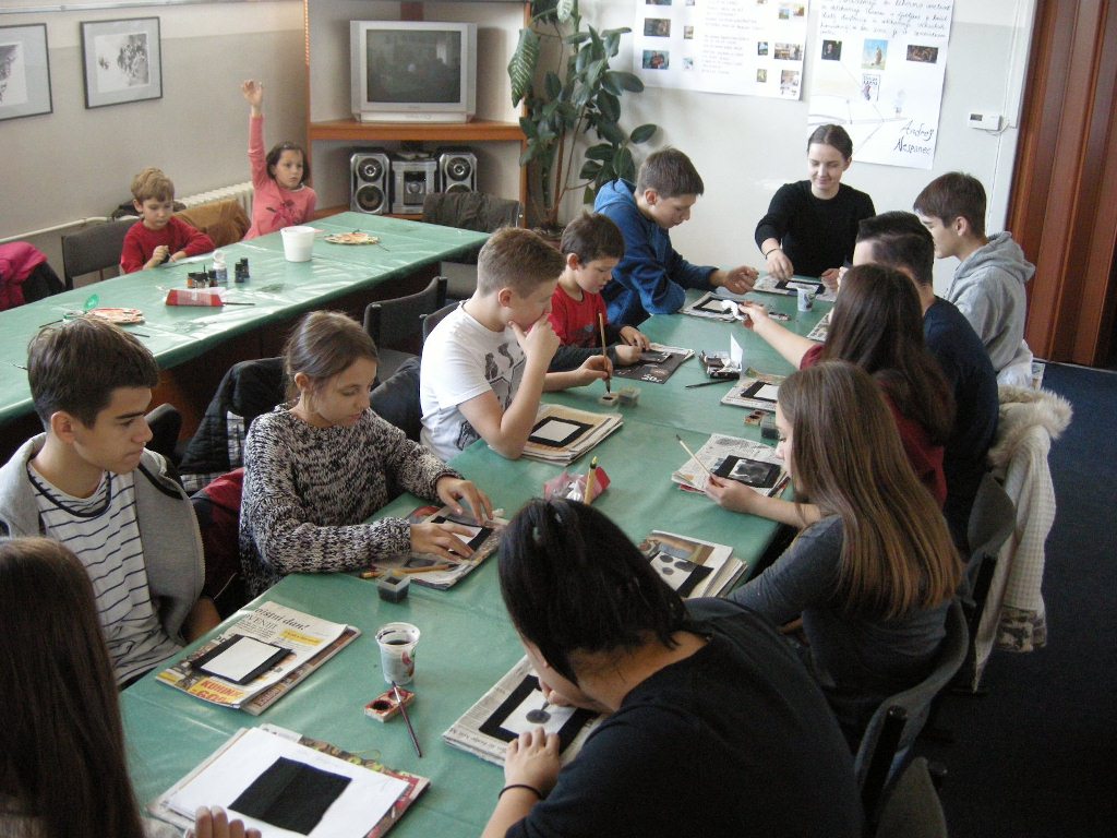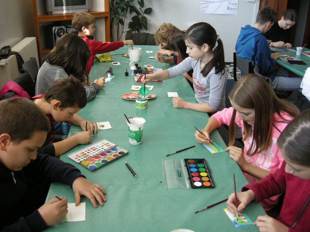 Profesorica Natalija Veselič Martinjak nas je že večkrat obiskala, učenci, ki so se lani in letos udeležili poletne šole Slovenščina malo drugače, ki jo pripravlja Slovenska izseljenska matica, pa so z njo ustvarjali tudi ob Kolpi in na Rogli. V soboto, 4. novembra, je v Klubu narodnih manjšin v Banjaluki predstavila zanimivo tehniko slikanja na rižev papir, slikali pa smo tudi akvarele. Ko so se naše slike posušile, smo jih nalepili na karton in nastale so lepe voščilnice. Leto 2017 se bo kmalu izteklo, izdelava voščilnic je bila del predprazničnega dogajanja. Učenci so uživali ob slikanju, nekateri so na voščilnice že zapisali voščilo v slovenščini.